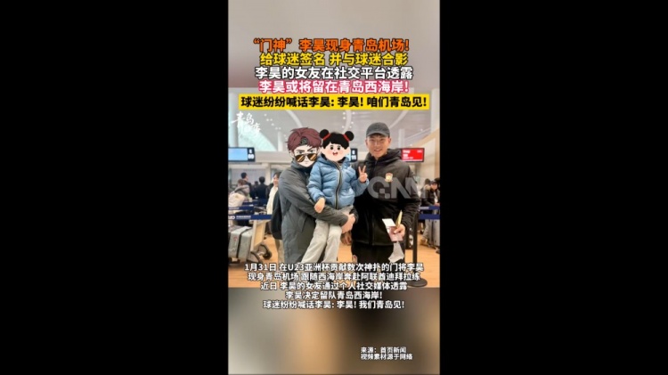 青岛新闻网报道称,1月31日,李昊现身青岛机场,跟随青岛西海岸奔赴阿联酋迪拜拉练。昨晚,李昊女友更新社媒晒出两人合照,并向网友确认李昊留在西海岸。