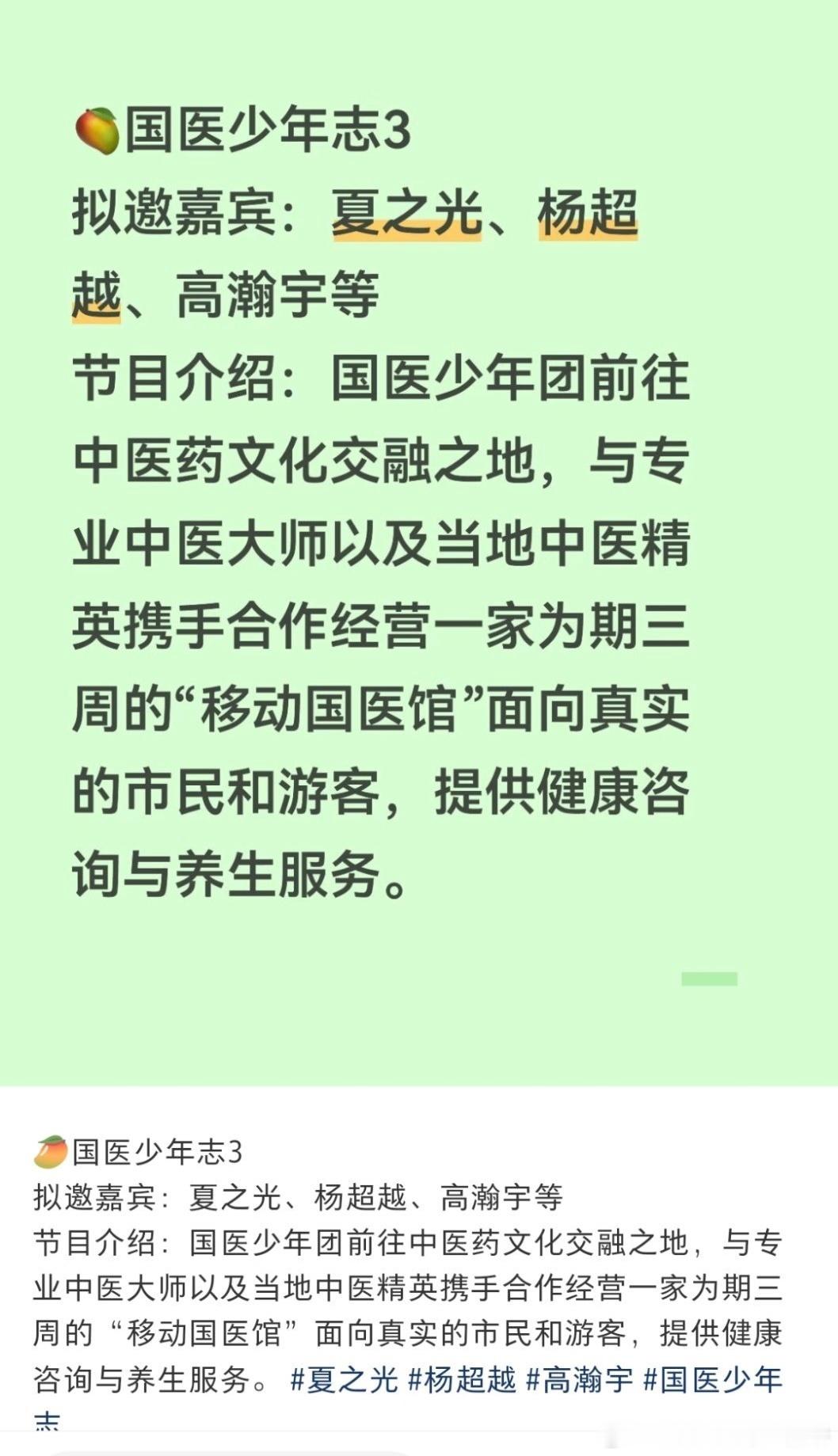 🥭国医少年志第三季要来了拟邀嘉宾:夏之光、杨超越、高瀚宇等