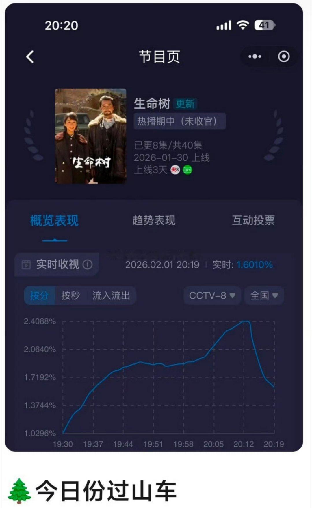 《生命树》第3日周末收视🈶,目前站内热度8452,周末晚上应该是要冲8500的新剧成绩看三天,整部剧的走势基本上已经尘埃落定了。加上2月6号冬奥会开始,肯定也会有一部分的分流杨紫演技 生命树上鲜活的枝丫生命树第8集反转