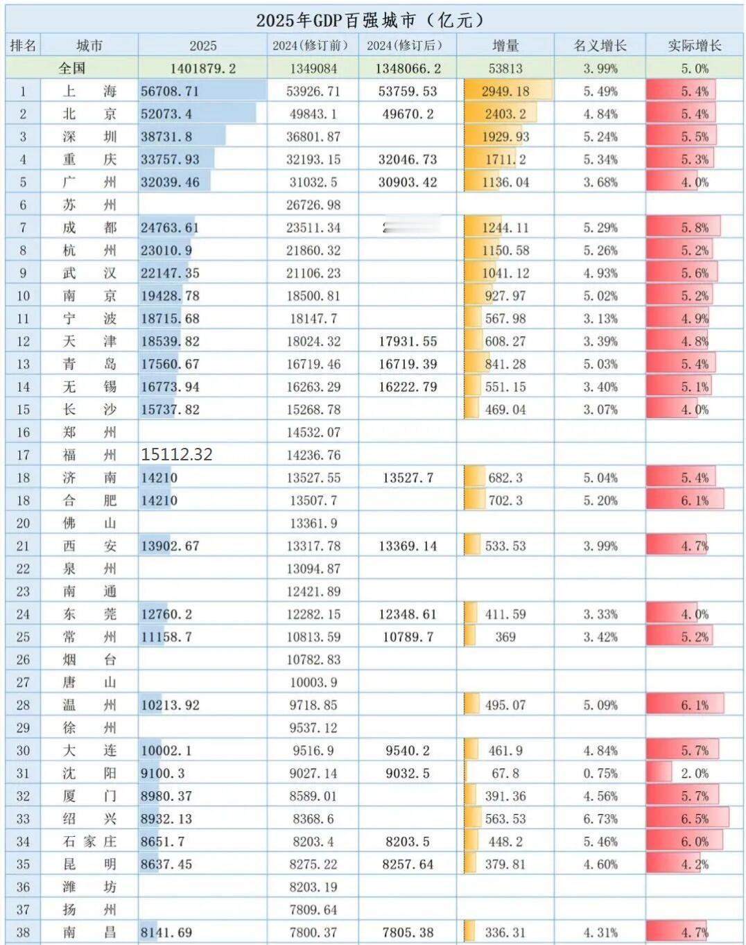 重磅!福州GDP超1.5万亿!直逼全国15强![小鼓掌] 数据显示,2025年福州GDP达15112.32亿元,按不变价格计算,同比增长5.6%。 值得注意的是,该成绩一口气超越济南(14210亿)、合肥(14210亿)、西安(13902亿)三大传统强市,距离全国GDP前15强仅一步之遥。