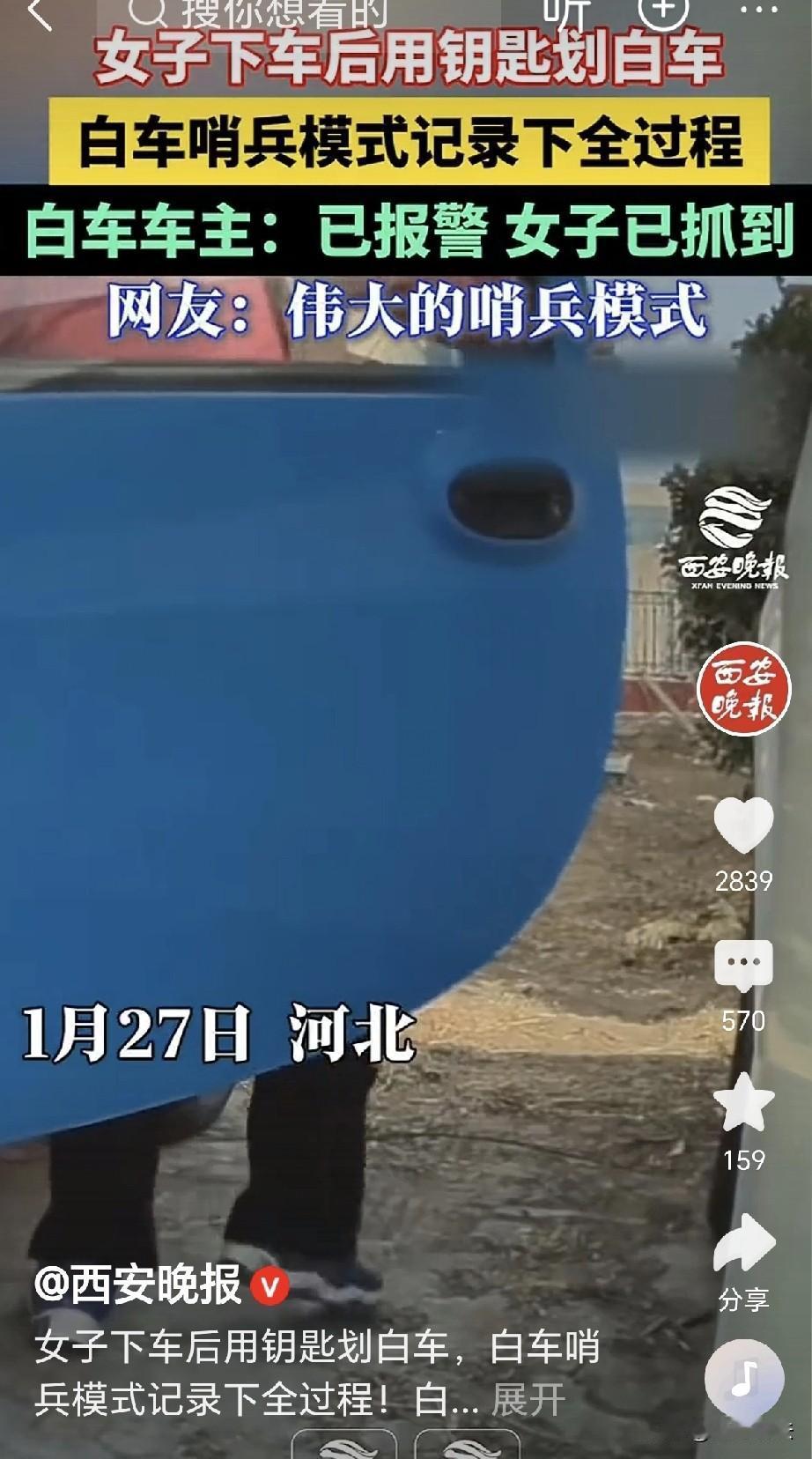 骨子里的坏!河北,一女子下车,发现旁边停着一辆白车,她拿出钥匙,故意把白车划坏,她以为无人看见,悄悄溜走了,谁知车主开启了哨兵模式,将她的罪行拍的清清楚楚,车主报警,女子悲剧了! 1月27日,一辆白色轿车静静的停在车位上,车身洁白如新,在阳光下泛着亮光。 这时,旁边开来一辆蓝色轿车,轿车开到了白车旁边,车辆缓缓停下,车门随之打开。 车上走下来一位女子,那女子身穿粉红的外套,下身穿着黑色的裤子,她利利索索,看起来很讲究的样子。 她看不来具体的年龄,下车以后,转身把自己的车门锁好。 按照常规,她锁好车门,就该去她该去的地方。 谁知这时,她做出一个惊人的举动,她朝车尾方向走去,左手拿着她的车钥匙。 她把钥匙头朝外,随手就朝旁边的白车上划去。 只听见车钥匙划在金属上的声音,那声音尖利,滋滋作响,就好像白车受伤,正在痛苦的嘶嘶的叫着。 女子下手狠厉,画完后还不过瘾,她又一次抬起了钥匙,再一次在车身上狠狠的划过! 眼看车上的白漆被毁坏的惨不忍睹,原本光滑的车上顿时出现了两道划痕。 她还不解恨,又来了一下,车身被划花,每一道划痕都像一道沟壑。 女子此时此刻,脑子里不知道在想啥,别人的车在她眼里,就像一块废铁一样。 她发泄了不满,心里长出了一口气,大概是白车比她的车高档,只有毁掉对方,才能解她的心头之恨! 那辆无辜的白车,就这样被她划破了相。 女子画完,她得意洋洋,好像车身上那一道道划痕就是她的杰出之作。 可是我就想不明白了,人家的车停在那里,既没招她也没惹她,她是干嘛非要划伤人家的车辆? 她划完之后,又往四周看看,周围静悄悄的,没有一个看到,她以为就这么悄无声息,自己就可以逃之夭夭。 谁知那辆白车开启着哨兵模式,早就把她的举动拍的清清楚楚。 女子悄然离开,以为她只要走远,即使是白车主发现,也是死无对证,肯定不会知道是被谁划的。 谁知她打错了算盘,不大一会,车主就回来了。 车主是个细心之人,他开车之前,先围着车身转了一圈。 车主赫然发现,车身上有深深的几道划痕,那划痕从头至尾,好似一把尖刀把车漆划开了。 车辆在那里无声的哭泣,车主顿时气的七窍生烟! 自己和人无冤无仇,车辆搁在这里也没碍着谁的事情。 即便是碍事,车上也留有联系电话,如果妨碍到了别人,自己肯定会第一时间挪走车辆。 车主朝四周望去,四周此时空无一人,他立刻查看哨兵模式录下的视频监控。 他这一看,可不得了,这是飞来横祸,无缘无故就被女子用钥匙划伤了车身。 车主愤怒,他立刻报警,警方展开调查,立刻就锁定了粉衣女子。 凭借着哨兵模式提供的清晰视频,没过多久,女子被抓获。 这会儿她傻眼了,如果白车损失超过了5000元,她将会面临刑事追责。 奇怪的就是,她和白色车主无冤无仇,俩人压根就不相识,白车没碍着她啥事,既没挡道,也没有违停。 她为何要做这种事情?有人猜测,她可能是生活不如意,将怨气发泄在了无辜的车上。 也有人认为,这人就是骨子里坏! 她以为没人看见就可以随心所欲的去做坏事,她没有想到,自己竟然栽在了高科技手上! 这要是修复,起码得花几千块钱,还有了前科,这辈子就算把号挂上了! 《刑法》第275规定:故意毁坏公私财物,数额较大或者有其他严重情节的,处三年以下有期徒刑、拘役或者罚金;数额巨大或者有其他特别严重情节的,处三年以上七年以下有期徒刑。 粉衣女子明知道那是别人的车,还故意用钥匙反复划车漆,就是典型的故意搞破坏。 现在就看白色轿车的定损结果如何,一旦车辆损失超过5000元,女子将面临刑事追责。 就算损失没到5000元,她也是逃不掉的。 《治安管理处罚法》第49条规定: 故意损毁公私财物,处5日以上10日以下拘留,可以并处500元以下罚款;情节较重的,处10日以上15日以下拘留,可以并处1000元以下罚款。 这事儿说白了就是女子自己作妖,大概率就是看到别人的车比自己车好,她心里不平衡,所以就干脆将对方划伤拉倒! 殊不知现在到处都是监控和汽车哨兵模式,她无知透顶,真以为做了坏事,只要没人看见,就能逃脱罪行。 她想错了,若要人不知,除非己莫为!最终只能是自食恶果!