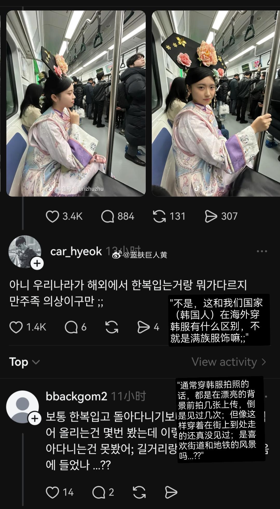 韩国人在外网上吐槽“有个中国女网红在韩国大马路和地铁上穿旗装格格服”
