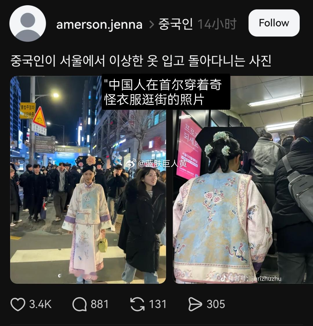 有华人女子穿这个服装在韩国街头行走,韩国网民破防了~