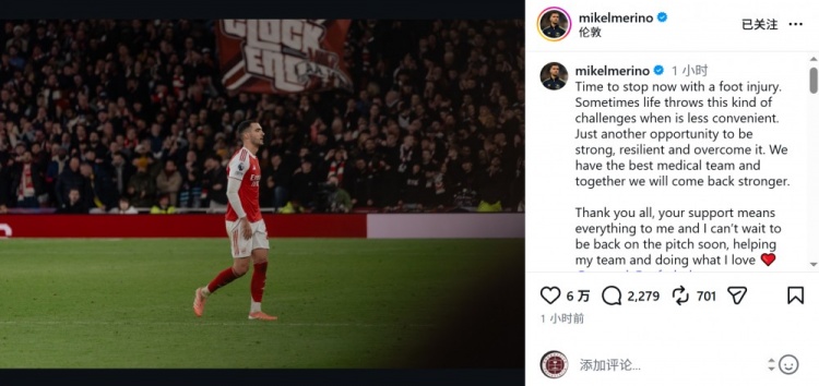梅里诺社媒谈伤病:迫不及待想早日重返球场,感谢大家的支持
