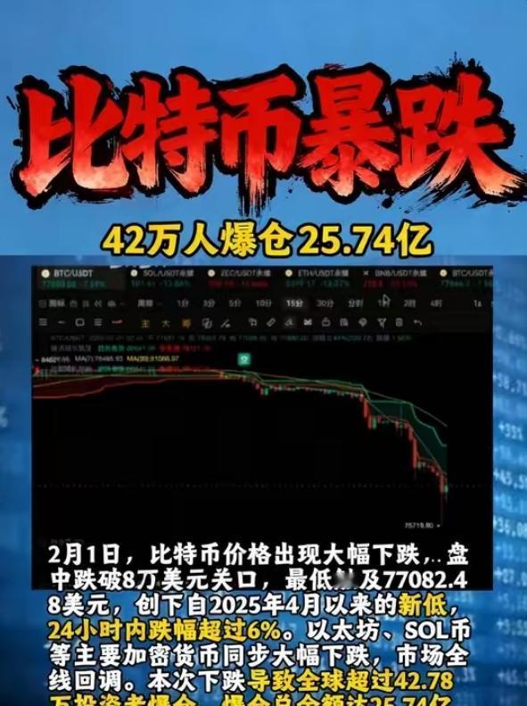 凌晨崩盘!比特币跌破8万关口,42万人爆仓25亿,“数字黄金”神话彻底碎了? 2026年2月1日凌晨,加密货币市场迎来“惊魂一夜”。龙头币种比特币盘中狂泻,一度跌破7.6万美元,创下2025年4月以来新低;截至发稿虽小幅回弹至7.85万美元,但24小时跌幅仍达6.6%,开年至今累计跌幅已扩大至10%,距离1月初9.7万美元的高位蒸发超1.8万美元。 这场暴跌迅速引发“多米诺骨牌效应”:以太坊单日最大跌幅超11%,最低触2202美元;Solana、狗狗币跌超10%,部分小市值币种跌幅甚至突破14%。据CoinGlass数据,24小时内全球加密市场总市值蒸发超1100亿美元(约合人民币7700亿元),超42万名投资者惨遭爆仓,爆仓总额达25.6亿美元,其中九成是看多的多单,最大单笔爆仓单(ETH-USD)出现在Hyperliquid交易所,价值2.22亿美元,不少加50倍、100倍杠杆追高的投资者,一夜之间账户归零。 “压垮骆驼的最后一根稻草”,是美联储政策预期的急转弯。1月30日,特朗普提名“鹰派”人物凯文·沃什出任下任美联储主席——沃什曾公开唱衰加密货币,市场预期其上任后将收紧货币政策、推迟降息,直接推动美元走高,资金疯狂从高风险的加密货币撤离,转向美债等安全资产。此前市场对2026年美联储降息2次的乐观预期彻底落空,即便美联储此前宣布维持利率不变,也没能拦住抛售潮。 更致命的是,加密市场自身“沉疴已久”。一方面,前期杠杆率飙至历史高位,比特币期货未平仓合约量创新高,价格小幅回调就触发集中爆仓,强制平仓又进一步压低价格,形成“下跌—爆仓—再下跌”的死亡循环;另一方面,机构资金持续撤离,1月比特币ETF单周净流出超12亿美元,现货交易流动性大减,大额抛单就能引发价格巨震。 曾被奉为“数字黄金”的比特币,如今连避险属性也荡然无存。此前美元走弱、黄金创历史新高时,比特币毫无反应;如今以色列与伊朗地缘紧张升级,避险资金仍扎堆涌入贵金属,比特币反而被持续抛售。太平洋投资管理公司直言,比特币“数字黄金”的叙事已“彻底消失”,市场至今没搞懂它的估值逻辑,更像是“一场没有根基的投机游戏”。 雪上加霜的是,全球监管还在持续收紧。2026年1月,香港将比特币等无担保加密资产的风险权重提至1250%,大幅提高银行参与门槛;美国也公布虚拟资产市场结构法案草案,限制稳定币收益。监管趋严让投资者更趋谨慎,进一步压制了交易情绪。 从2025年10月12.4万美元的历史高点,到如今跌破8万美元,比特币半年内市值蒸发超三分之一。这场暴跌究竟是短期回调,还是加密市场寒冬的开始?你觉得比特币还有翻身的可能吗?欢迎在评论区留言讨论!
