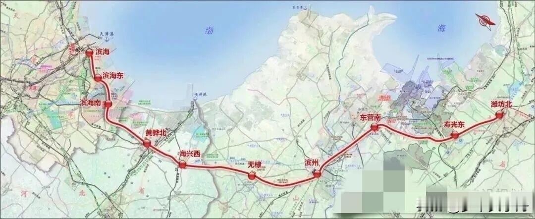 好消息!津潍高铁建设进入关键节点。最新消息显示,2026年底前,津潍高铁东营段将率先具备验收条件,这标志着整条线路向着全线开通运营迈出实质性一步,看看经过你的家乡吗? 作为国家“八纵八横”高速铁路网沿海通道的关键路段,以及京沪辅助通道的重要组成部分,津潍高铁的战略意义不言而喻。项目起自天津滨海站,终至潍坊北站,线路全长348.9公里,纵贯天津、河北、山东三省市的滨海新区、沧州、滨州、东营、潍坊等重要城市群。 另外,全线规划设置滨海、滨海东、滨海南、黄骅、海兴西、无棣、滨州、东营南、寿光东、潍坊北共计10座车站,建成后将形成串联环渤海与山东半岛的高效运输走廊。 目前,从天津前往潍坊乘坐传统铁路需耗费约4小时,津潍高铁投入运营后,这一时间将大幅压缩至1.5小时左右。对于山东半岛北部的核心城市东营而言,其交通区位将获得历史性提升,至天津、济南、青岛等周边主要城市的旅行时间都将缩短至1小时以内,真正融入“一小时都市圈”。 据悉,项目正按计划稳步推进。东营段作为先行具备验收条件的区段,其进展为后续全线联调联试和最终开通奠定了坚实基础。展望2026年底,随着工程节点的逐一达成,一条纵贯山东半岛的南北向高铁大动脉即将呈现在人们面前,为沿线经济社会发展开启“高铁速度”的新篇章,值得期待!