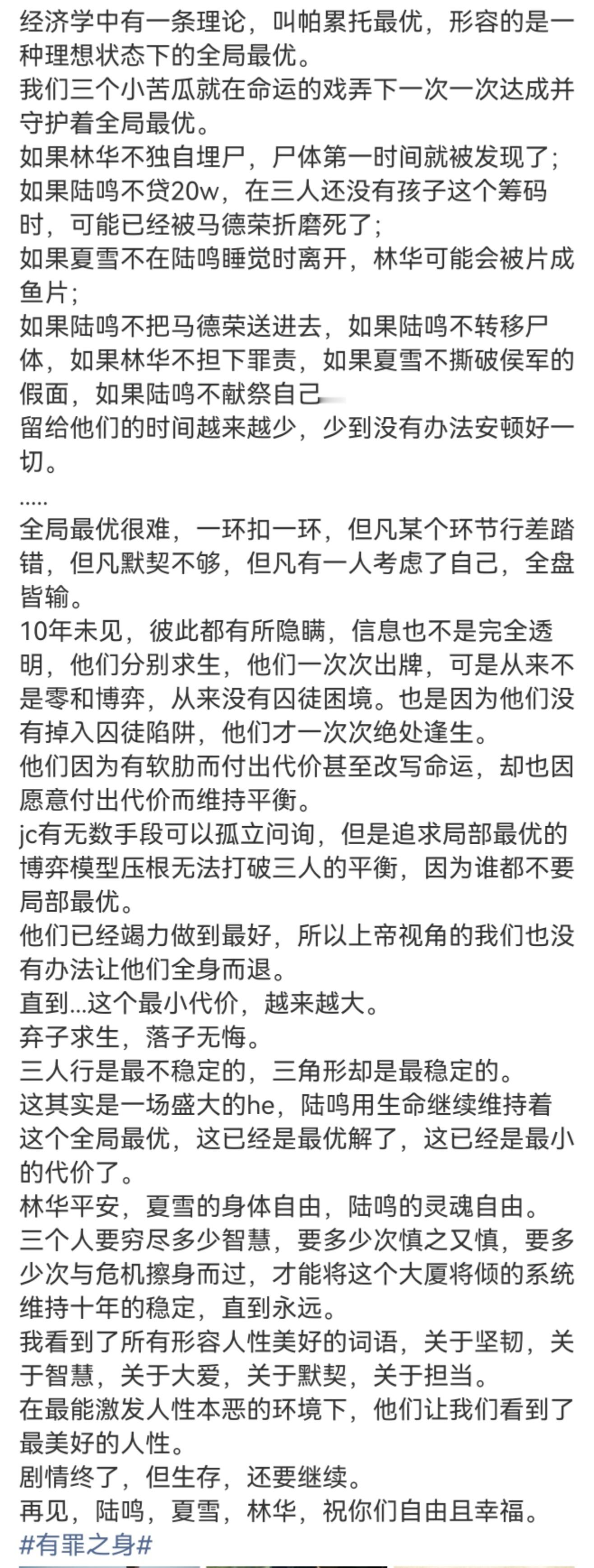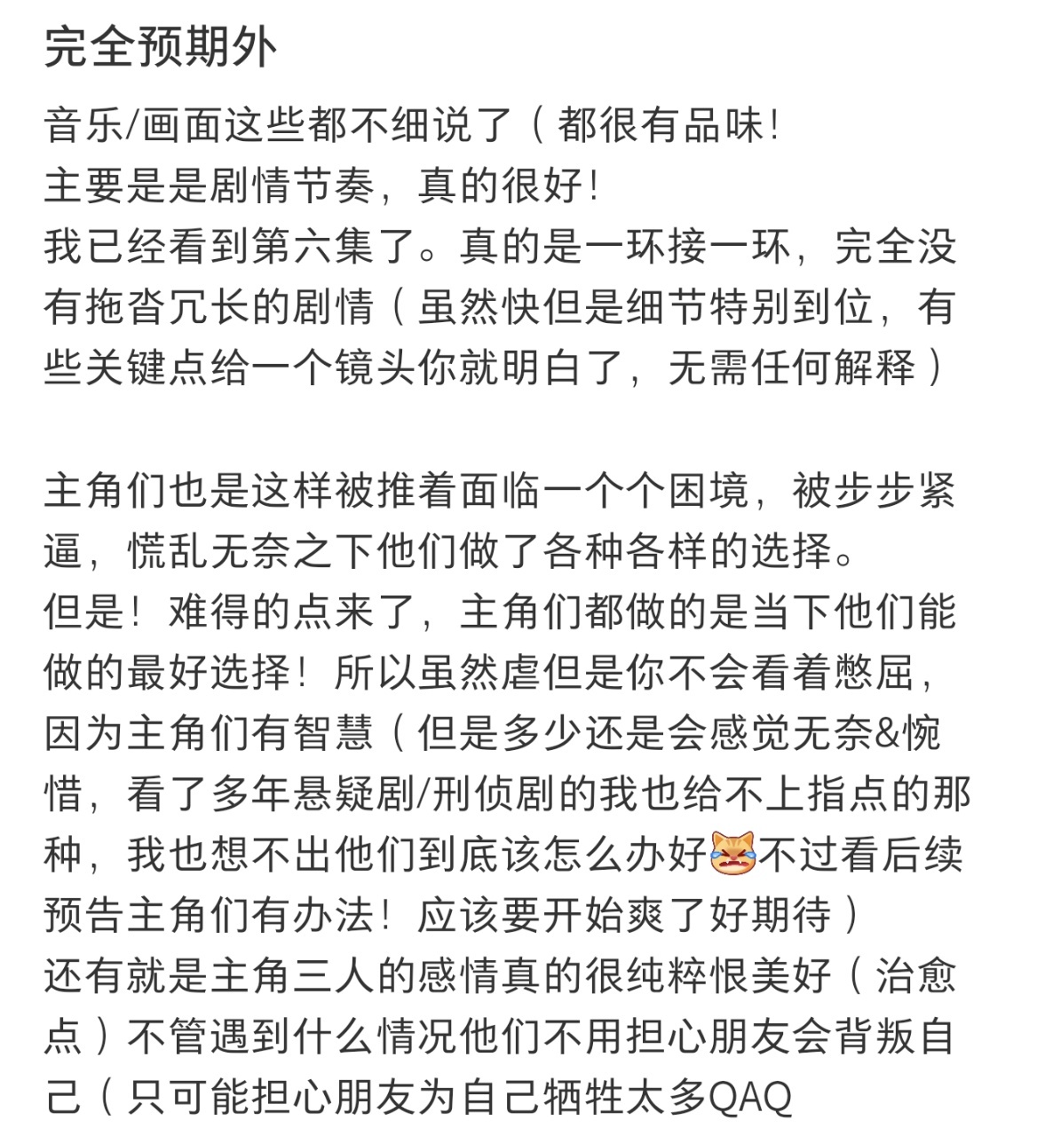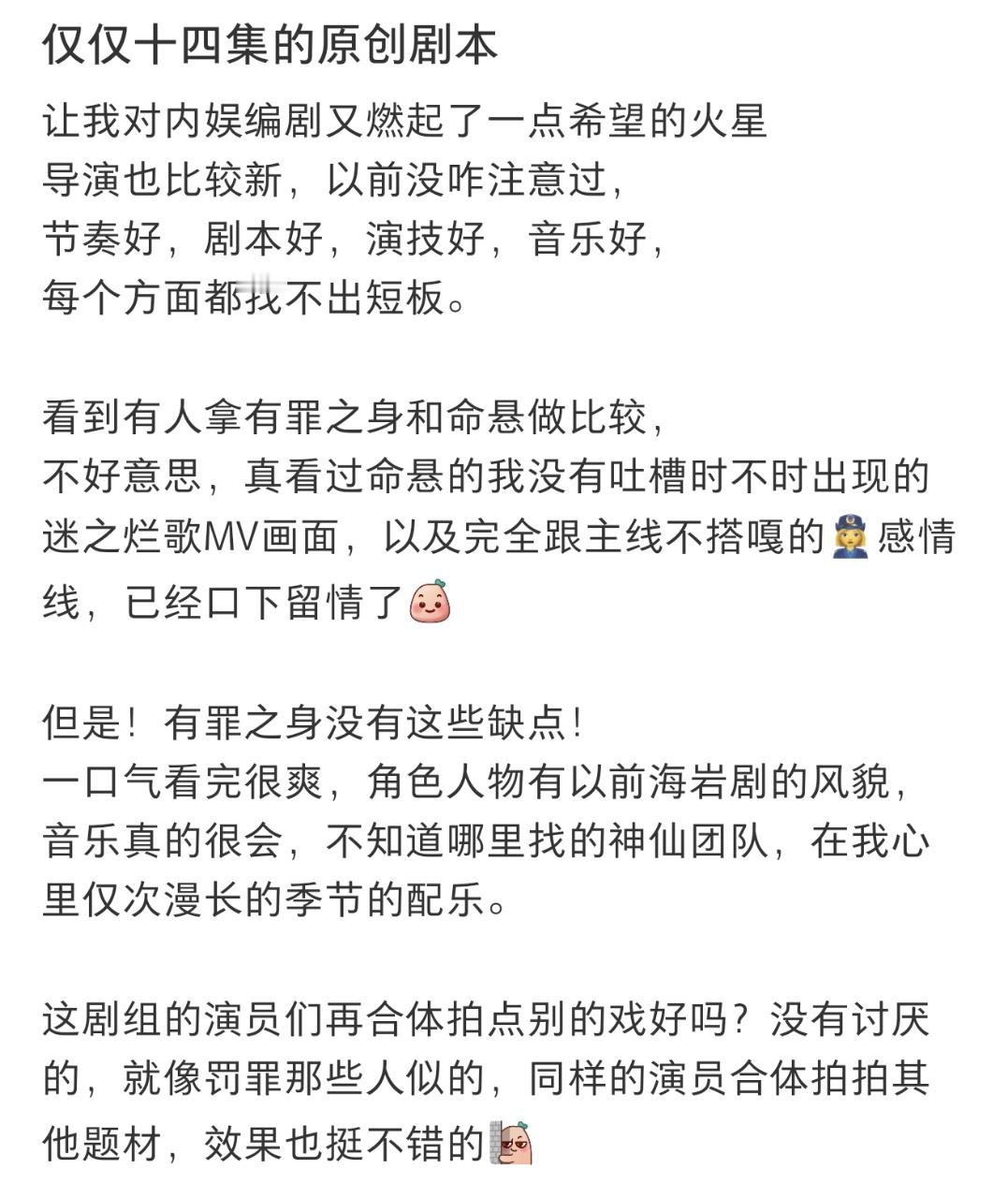 有罪之身真诚才是必杀技 不炒噱头、不水剧情,14集讲好一个完整故事,这才是国产剧该有的样子。陆鸣、夏雪、林华的命运纠缠,每一次选择都带着身不由己的痛,反派不脸谱化,善恶皆有因果。配乐与剧情高度适配,细节拉满,越品越有味道。有罪之身