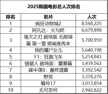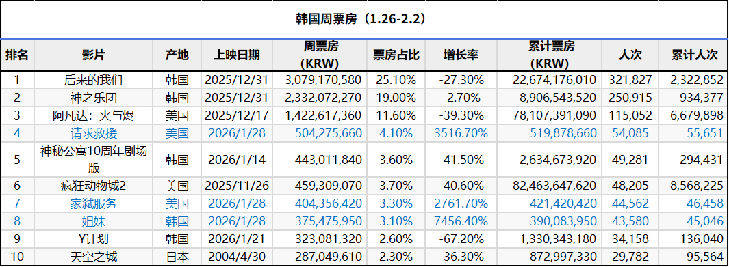 2026年第5周韩国票房 :1.《后来的我们》四连冠,累计观影人次232万;2.《请求救援》在新片中表现最佳。(数据:韩国电影振兴委员会)