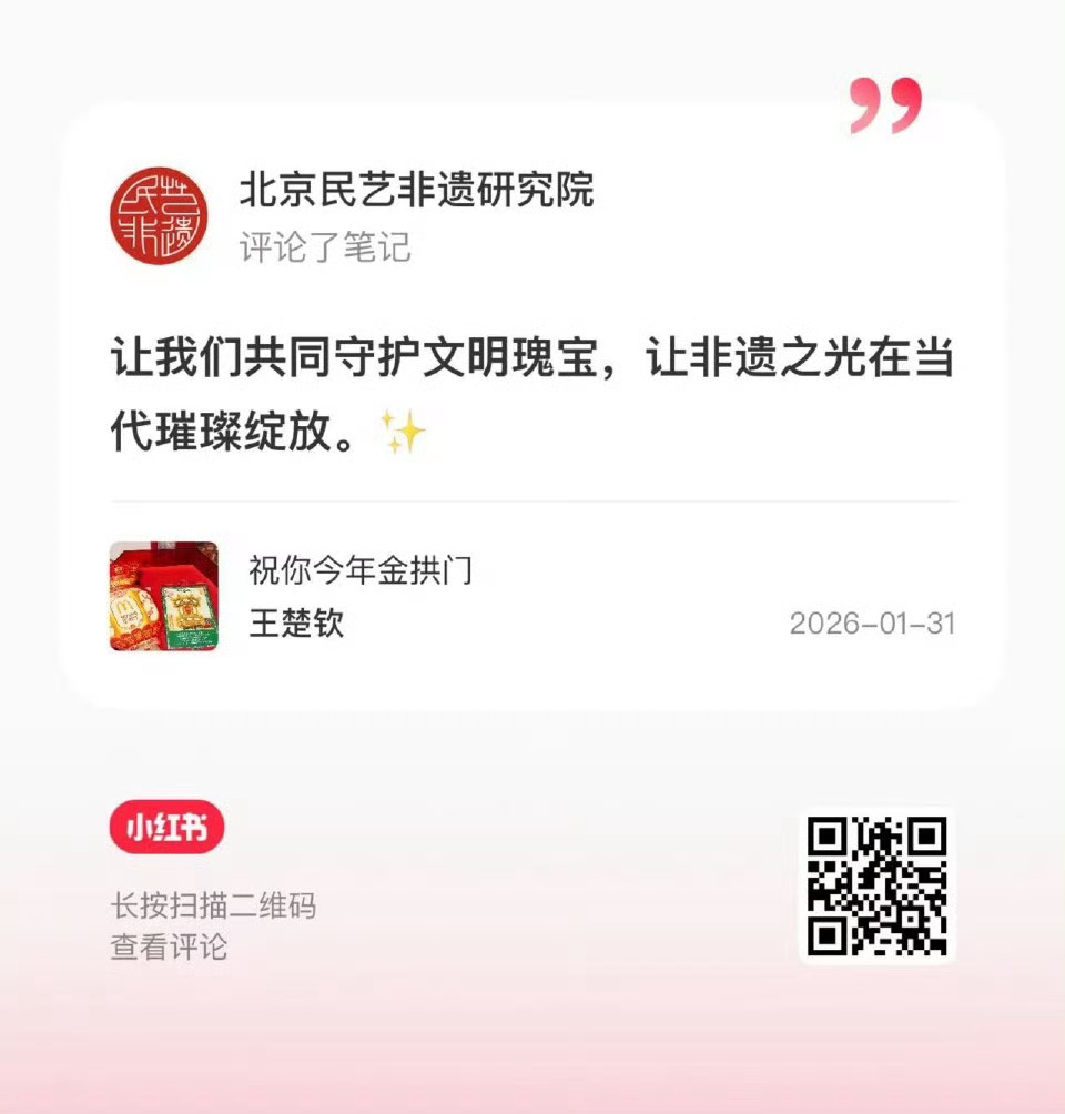 狮友会王楚钦 北京民艺非遗研究院🍠给楚钦留言:“让我们共同守护文明瑰宝,让非