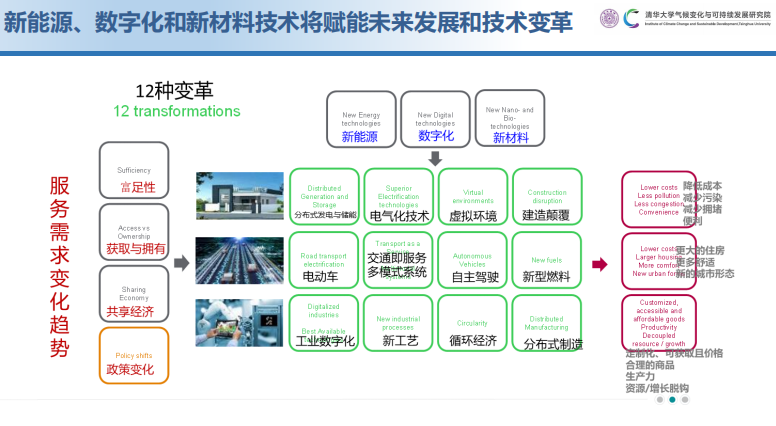 李政介绍,他的课题组和法国施耐德公司做了联合研究,数字技术要发挥作用,前提是要对经济社会有新的认识。新能源技术、新材料和制造技术、数字化技术,这三个基本技术将支撑未来经济社会的变化。未来经济社会因为“政策驱动”“共享经济”“获取和拥有的变化”“富足性”等变化产生了4种塑造未来的力量,“新能源”“数字化”“新材料”三种技术会创造出在工业、交通、建筑等方面的12种变革。