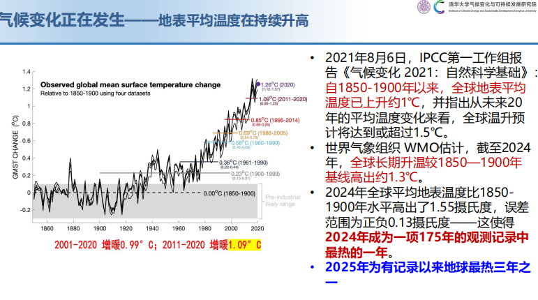 “2024年是有纪录以来最热的一年,2025年是有纪录以来最热的三年之一,形势很严峻。”李政介绍,《巴黎协定》提出的到本世纪末升温控制在1.5℃的目标,实际上在2024年已经突破了。这只是单年的突破,在长时间尺度上,这是一个征兆。IPCC第一工作组的研究报告《气候变化2021:自然科学基础》显示,自1850年—1900年以来,全球地表平均气温已上升约1℃。未来20年的平均气温变化来看,全球升温预计达到或超过1.5℃。