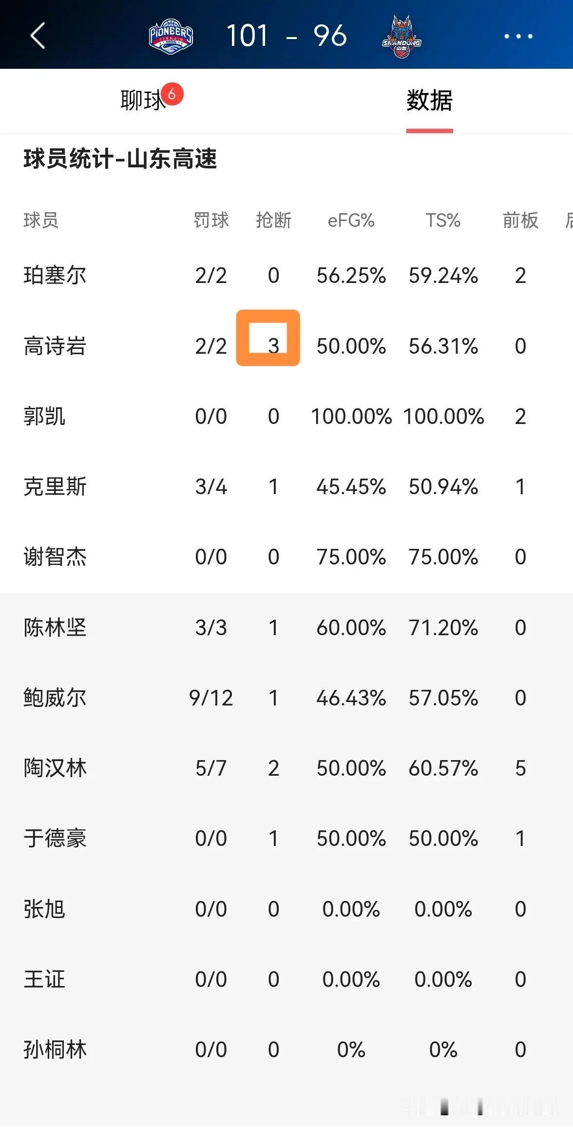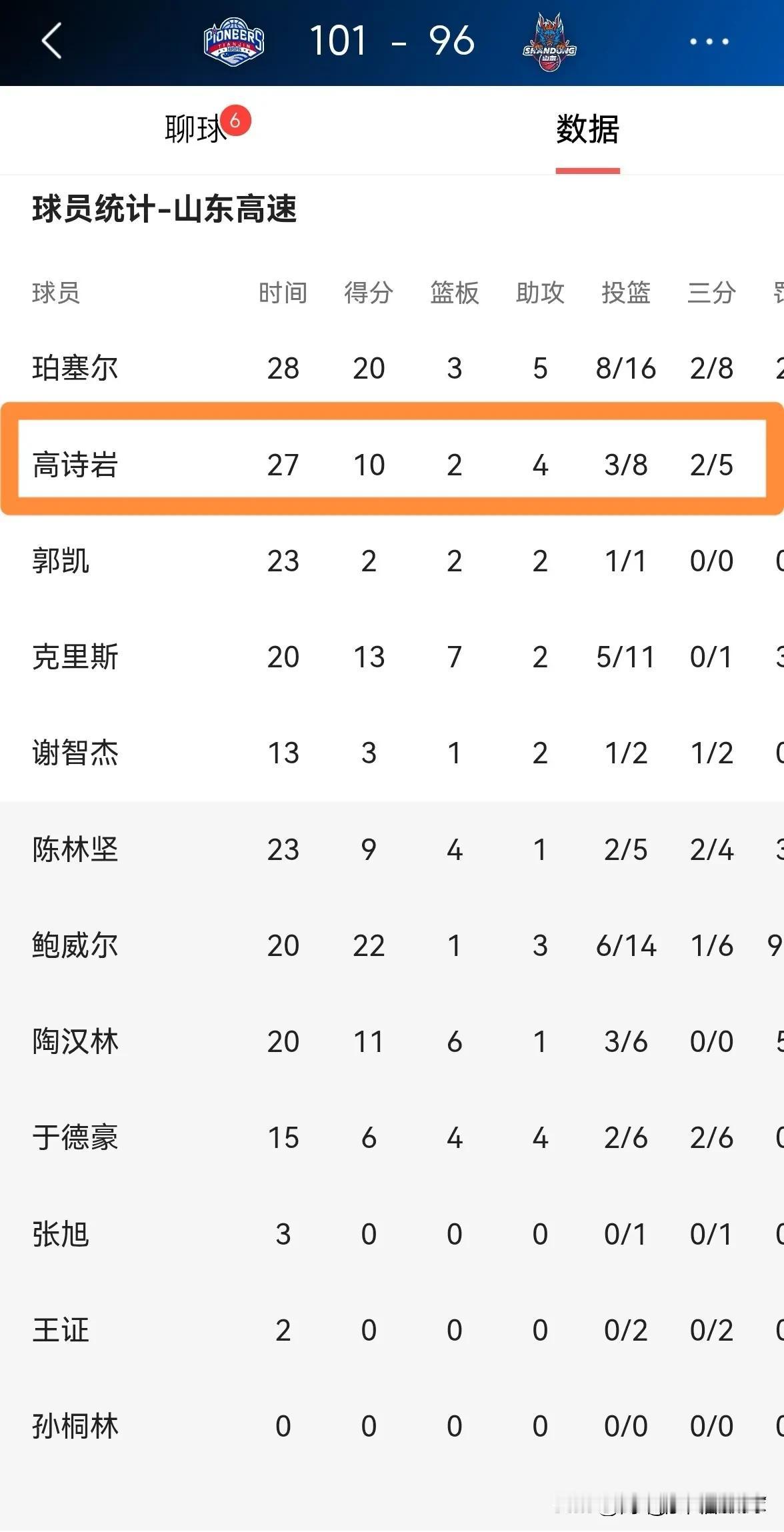 高诗岩真是虽败犹荣!虽然今天山东高速在客场以96:101惜败于天津先行者,但是高诗岩一如既往的兢兢业业、拼尽全力,为了球队毫无保留的付出了自己的全部。 山东高速输了球,高诗岩却赢了人心。客场96-101惜败天津先行者,这场球打得窝火,可当家控卫的表现,让人挑不出毛病。 首发出战27分钟,高诗岩像上了发条的钟,一刻没停。投篮8中3,三分5中2,罚球2中2,10分2篮板4助攻3抢断,最难得的是,零失误。这份数据单不算华丽,却透着股咬牙硬拼的劲儿。 控卫是球队的大脑,稍有不慎就可能满盘皆输。高诗岩这场像揣着定心丸,传球稳准,防守拼命,3次抢断像饿狼扑食,每一次都往死里争。没有失误的控卫,就像走钢丝不掉下来,看着轻松,实则全凭硬功夫。 比赛胶着时,他带着替补打反击,三分线外抬手就有;落后时,他弯腰捡地板球,冲在最前面。球迷看在眼里,这哪是打球,是把自己豁出去给球队当基石。 输球的夜晚,总有人要扛着责任,高诗岩就是那个主动把担子往肩上压的人。老话说“患难见真情”,球场上也是如此。顺境时的风光不算啥,逆境里的坚守才珍贵。 高诗岩这场没刷出漂亮数据,可他的每一分、每一次传球、每一次抢断,都像给球队续着命。第四节分差咬到2分时,是他的抢断差点掀翻局势,虽然后来没能逆转,那份拼劲已经刻在了场地上。 山东输了比赛,却让人记住了高诗岩的兢兢业业。这种球员,或许不是最耀眼的星,却是球队最离不开的锚。他用零失误告诉所有人,控卫的本分是什么;用3次抢断证明,防守的态度有多重要。 赛后更衣室里,他肯定不好受。可球迷心里清楚,这样的球员,输球也输得有骨气。下一场球,他照样会第一个站出来,带着球队往前冲。这就是控卫的担当,赢了一起狂,输了独自扛。 高诗岩这场的表现,比赢球更提气。因为竞技体育里,拼尽全力的失败,从来都不算真正的输。