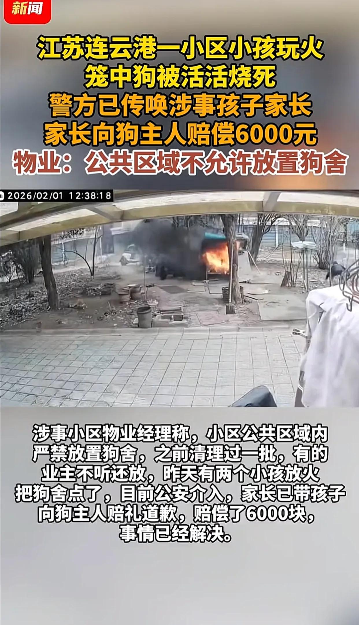 连云港两个小孩三分钟烧死一只狗!2月1日,江苏连云港,两名男孩点燃烟火,想要逗鸡玩,却不慎点燃旁边的狗笼,眼见火势越来越大,男孩着急找路人求助,可惜求助未果,眼睁睁地看着笼子里的狗发出惨叫,最后被活活烧死!网友:真是熊孩子! 小区监控拍下的画面里,一开始只是两个孩子手里攥着烟火,嬉笑着想引院子里的鸡扑腾起来。谁也没料到,火星溅到狗笼旁边的旧木板上,眨眼就窜起了火苗。狗笼是用木头和铁丝网搭的,风一吹,火舌就裹住了整个笼子。那只被关在里面的狗,从一开始的吠叫变成撕心裂肺的惨叫,爪子疯狂抓挠着铁丝网,却根本冲不出去。两个孩子慌了神,跑着去找大人帮忙,可路过的路人要么没反应过来,要么觉得事不关己,没人停下脚步。不过短短三分钟,笼子就烧得只剩铁架,那只狗也没了声息,蜷缩在焦黑的角落里。 事后物业站出来说,小区公共区域早就不让放狗舍了,之前清理过好几次,总有业主偷偷把狗笼放在这里。狗主人图省事,把狗扔在露天的笼子里不闻不问,才给这场悲剧埋下了隐患。孩子家长最后赔了6000块钱,带着孩子给狗主人道了歉,事情看似了结,可心里的疙瘩却没那么容易解开。 有人骂孩子不懂事,拿着烟火到处乱晃,是典型的“熊孩子”。也有人说,家长平时没教好孩子玩火的危险,出了事才来赔钱道歉,早干嘛去了。更有人把矛头指向狗主人,明知道公共区域不能放狗舍,还把狗长期关在这种易燃的笼子里,这不仅是对小区公共秩序的漠视,也是对自家宠物的不负责任。要是狗主人能把狗养在室内,或者给狗笼换个防火的材质,这场悲剧说不定就不会发生。 这件事里没有真正的赢家。家长除了赔钱,还要花更多时间去教孩子什么是责任,什么是敬畏生命。小区里的其他业主也跟着揪心,看着好好的一条狗被活活烧死,谁心里都不是滋味。 这件事也给所有人提了个醒,小区不是法外之地,公共区域的规则得人人遵守。家长得看好自己的孩子,别让他们拿着危险物品到处跑;养宠物的人也得负起责任,别把宠物当成累赘,更不能为了自己方便就破坏公共秩序。很多悲剧,其实都是一点点小事攒起来的,多一份用心,就能少一份遗憾。