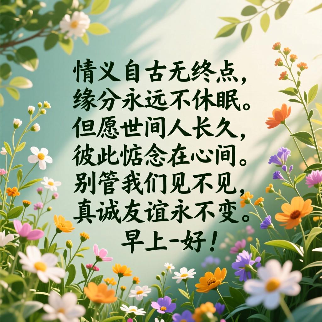 早晨的祝福分享情义自古无终点,缘分永远不休眠。但愿世间人长久,彼此惦念在心间。别