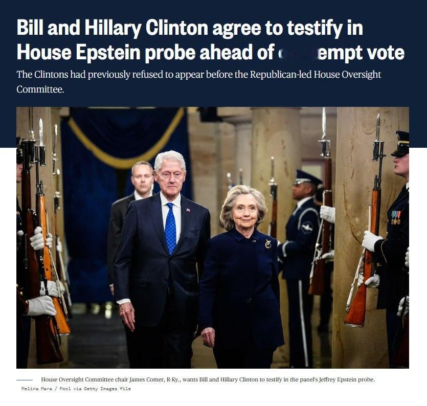 美国前总统比尔·克林顿和前国务卿希拉里·克林顿同意在众议院监督委员会面前作证,作为其对杰弗里·爱泼斯坦调查的一部分。就在几天前,众议院原定就克林顿夫妇长期拒绝遵守传票一事进行投票,决定是否对他们实施藐视国会的处罚。
