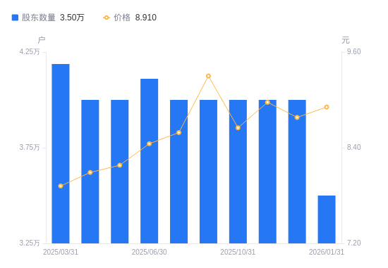 近一年(2025年1月31日至2026年1月31日),徐家汇A股股东户数从4.5万户,减低至3.5万户,降幅22.22%,区间股价上涨9.73%。