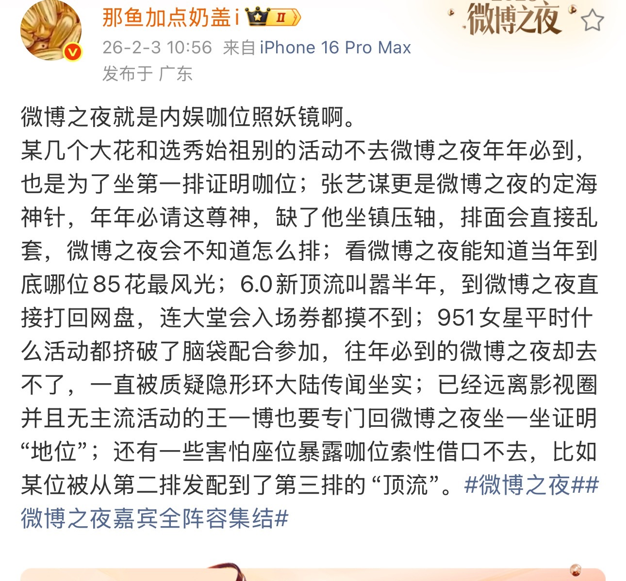 微博之夜不去的10个有9个是位置谈崩了,其实这批人咖位也不大,去不去无所谓,不像