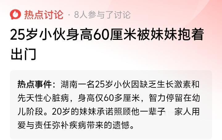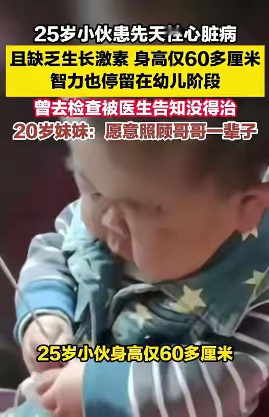 湖南25岁“不老男孩”身高仅60厘米,妹妹含泪誓言:哥哥,我养你一辈子!背后真相令人心碎又温暖 当你在街头看到一个20岁的女孩,怀里小心翼翼抱着一个看似幼儿的身影,你是否会想到,那竟是她25岁的哥哥?在湖南一个平凡的家庭里,藏着这样一个不平凡的故事。25岁的他,身高永远停在了60厘米,智力也如孩童,可妹妹一句“我照顾哥哥一辈子”,却让万千网友泪崩。 这个家庭曾经历过怎样的绝望?母亲回忆,当年跑遍医院,医生那句“没得治了”像一把刀扎进心里。生长激素缺乏、先天性心脏病、贫困如三重大山,压得人喘不过气。可他们没放弃,这个被命运按下暂停键的男孩,在家人的臂弯里,被温柔地接住了。 他喜欢听着音乐手舞足蹈,爱盯着手机屏幕里五彩斑斓的世界。虽然说不出复杂的句子,但笑容干净得像山涧的泉水。妹妹说:“哥哥只是长得慢一点,但他什么都懂。”是啊,爱从来不需要华丽的言语,一个眼神、一次依偎,便是全部。 20岁的妹妹早早扛起了生活的担子。当同龄人还在憧憬未来,她已坚定地把哥哥写进了自己人生的每一页计划里。“有我在,哥哥就能一直当个快乐的孩子。”这份超越年龄的担当,不是悲情,而是亲情最坚韧的底色。 我们总抱怨生活不够完美,却忘了有些人光是活着就已用尽全力。这个家庭从未向社会伸手乞求怜悯,他们用最朴素的方式诠释着:爱不是看着你奔跑,而是在你无法站立时,成为你的双腿。 网友的评论里,有人感叹“这才是真正的长生不老”,有人暖心鼓励“妹妹是天使”。但比猎奇更重要的,是看见苦难中开出的那朵花——命运可以剥夺健康,却夺不走人与人之间紧紧相依的温暖。 在这个快节奏的时代,我们习惯了计算得失,可总有一些人,用一生去守护另一个生命,不求回报。他们或许没读过多少书,却懂得最深的道理:所谓家人,就是无论你变成什么模样,我都不松开的手。 如果你也被这份亲情打动,请点亮右下角,让这份爱传递得更远。愿每个被命运考验的生命,都能被温柔以待。 (来源:综合大河报、站长之家等媒体报道) 亲情无价 生命韧性
