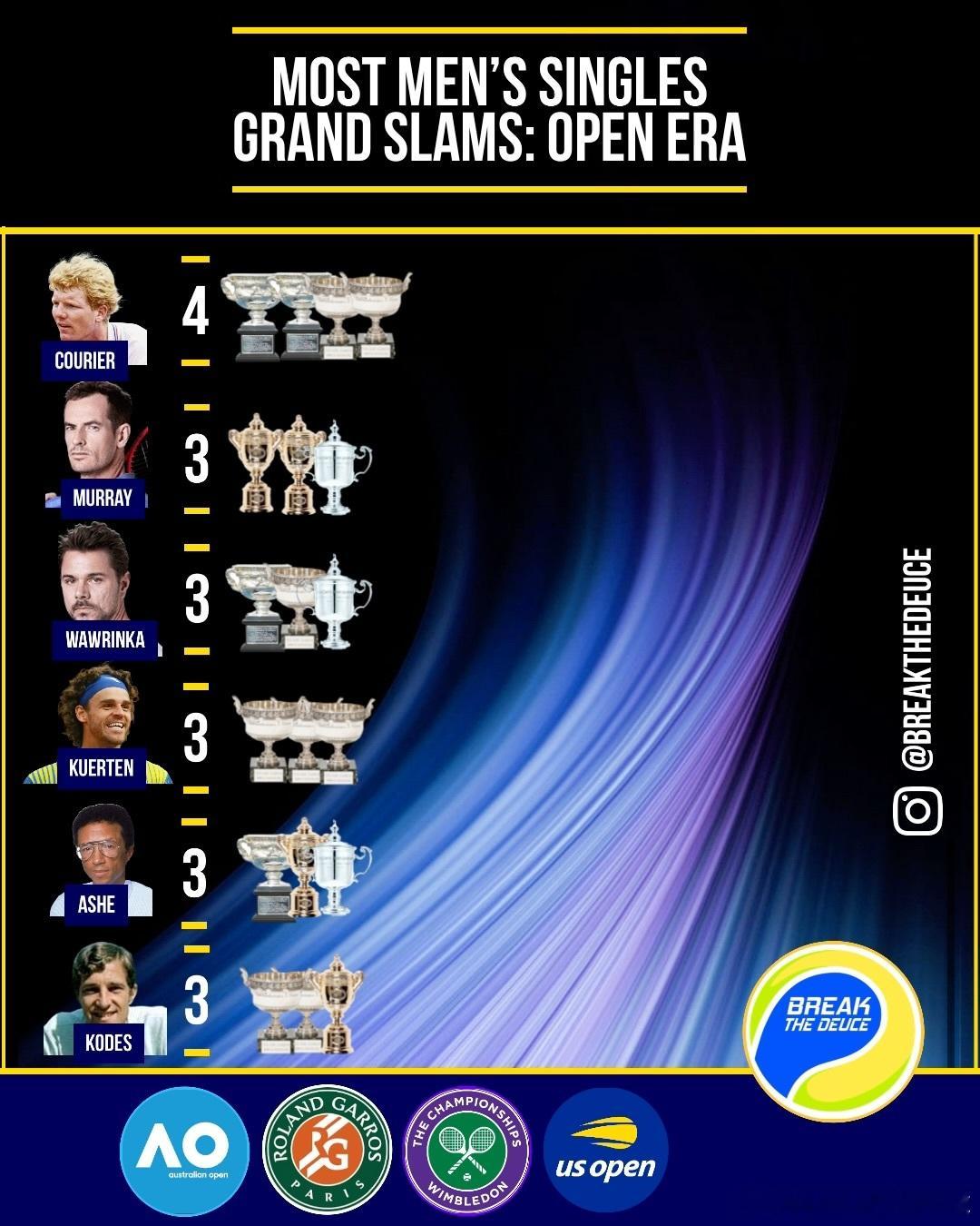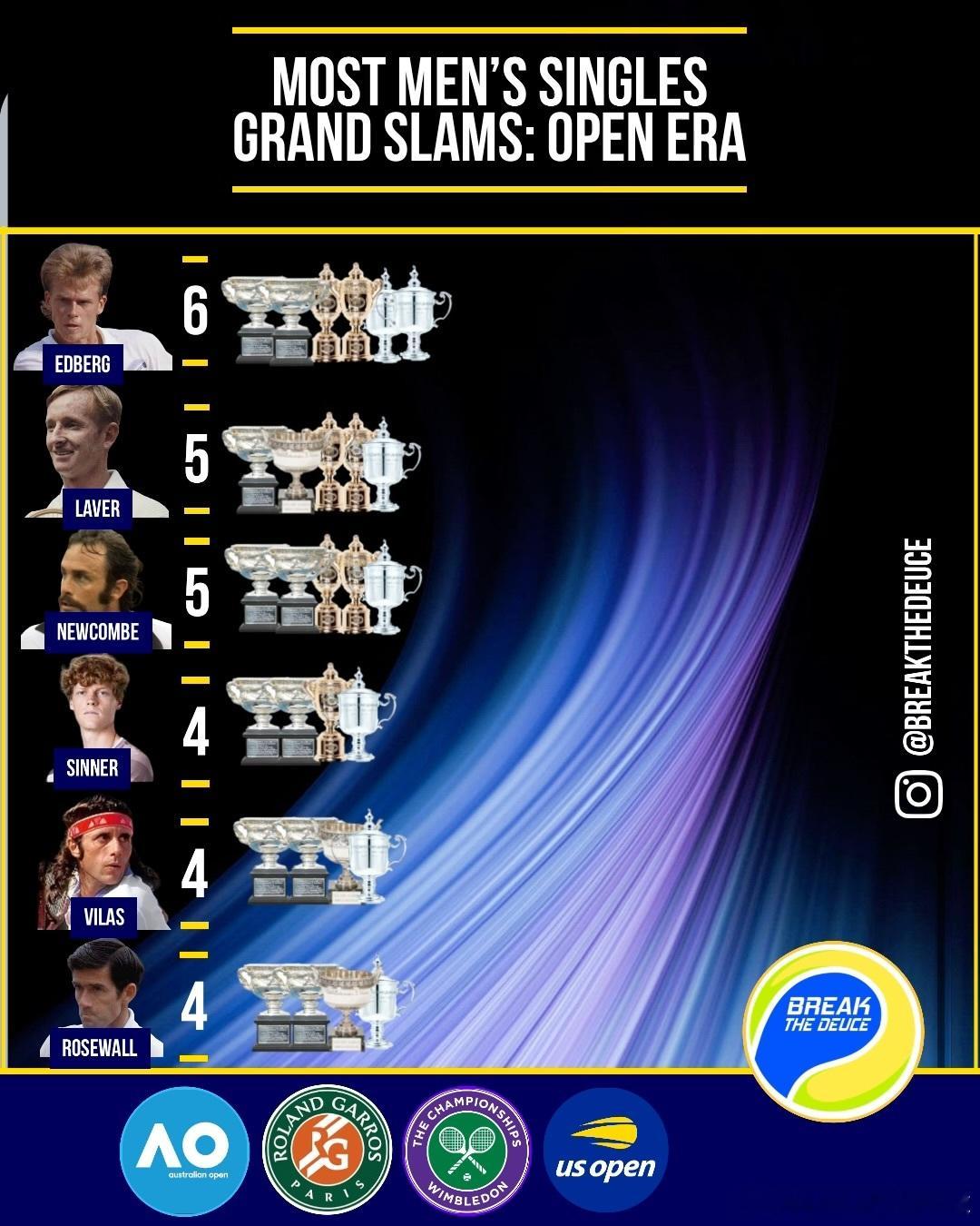 目前排在首页的是1️⃣德约科维奇242️⃣纳达尔223️⃣费德勒204️⃣桑普拉斯145️⃣比约博格116️⃣康纳斯8