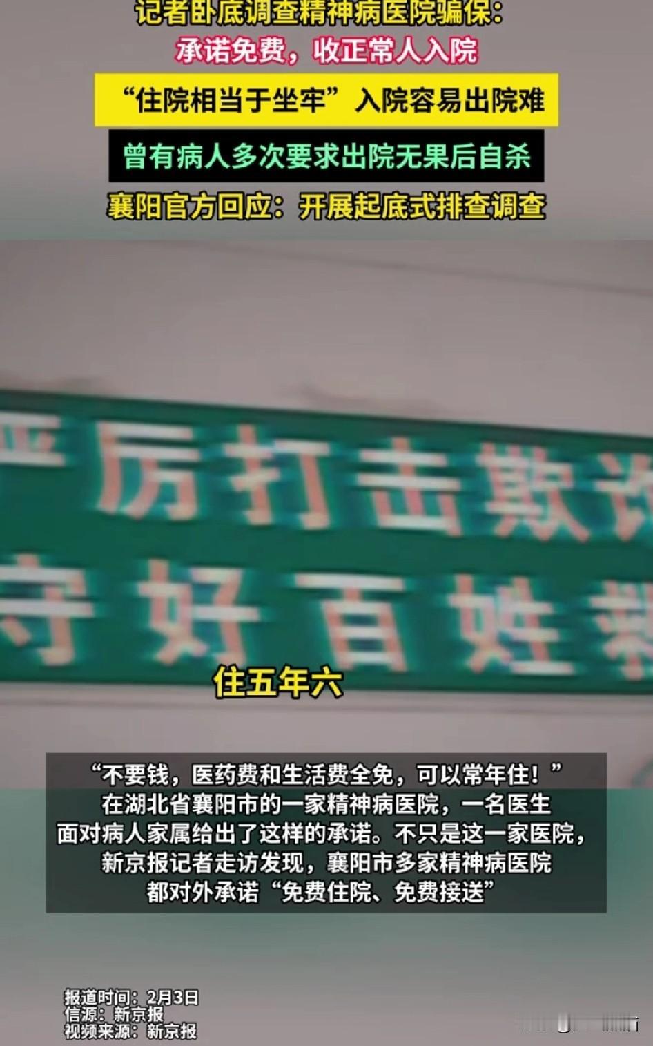 一个地方竟然有20多家精神病院,这事看着就不靠谱! 新京报记者卧底襄阳精神病院,因为这些医院打着不要钱,医药费和生活费全免,可以常年住的口号,进去之后才发现,大多数人并没有精神方面的疾病,都是为了蹭吃蹭喝来养老的,最最让人想不到的是,记者是以护工的身份进去的,还有其他的护工和保安,也被医院办理的手续成为了“精神病人”。 之所以有这么离奇的操作,就是医院方面为了套取医保资金,每人每月都会套现5000,所以说才会有开着车去村里找患者,拉患者的现象出现。 就是想问问,这20多家精神病院是怎么通过审批的!