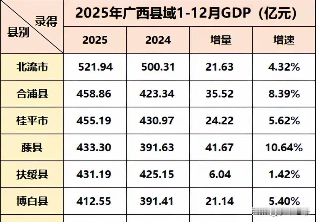 谈到广西的县域经济, 这几县市还是比较有意思! 2025年北流依然是稳居第一的宝座,然而一度被认为是县域经济的黑马,且喊着要争做第一强县的扶绥县突然歇火了,被藤县给超了!2025年藤县增速亮眼,得益于工业发展,同样的合浦也不赖,这两个县表现喜人!但除了北流之外,不知道大家有没有发现,后边这几个县市可是轮流表现,轮流发力[大笑]请用一句描述广西风景好吗 广西经济 广西各县gdp 广西县域gdp gdp十强县区 北流城市