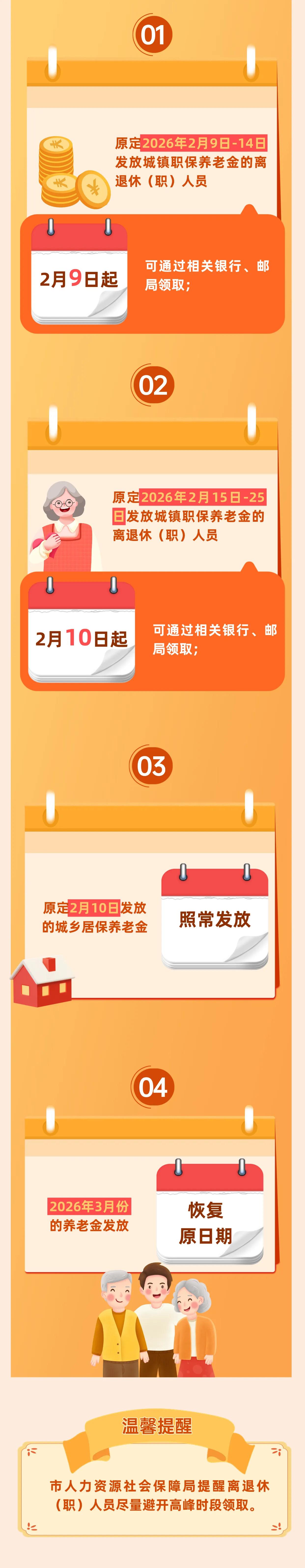 2026年春节将至,2月份的养老金会提前发放吗?部分人真的会提前领到2月份的养老金。 今年春节假期是2月15号到2月23日,一共长达9天的时间,而这个日期正好是很多地方发放当月养老金的时期,因为横跨了中下旬。 所以这就涉及到了一个问题,养老金的发放日期遇到了节假日,那该提前发放还是延迟发放呢? 很多地区是选择了提前发放。比如上海人社局已经明确,原来在2月9号到2月14号发放的城镇职工的养老金,2月9号就提前发放了。原来是2月15号到25号发放的城镇职工养老金,2月10号就能够领取了。城乡居民养老金也是从二月十日发放。 说实话,我们一定要为上海点赞,因为这些年养老金发放的日子一旦遇到节假日,上海就会选择提前发放养老金。 这样的做法是十分贴心,十分暖心的,毕竟退休人员们春节期间花销大,晚发养老金不如早发养老金,能够缓解很多人的春节期间的开支压力。 相信提前发放养老金的地区不只是上海,还会有很多地方也会提前发放养老金。 为这些地区点赞。