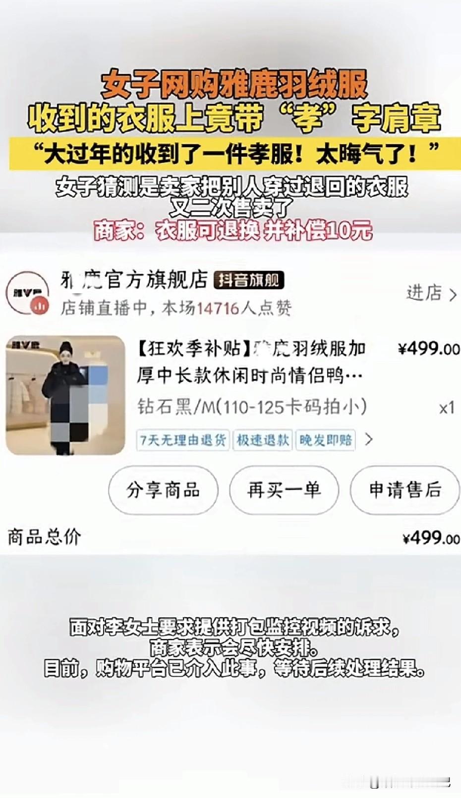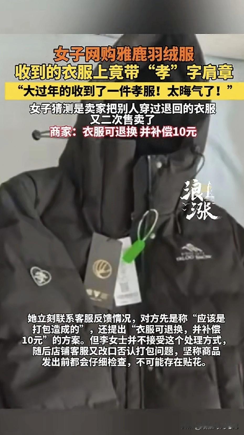 大过年的,吉林李女士拆开快递,当场吓出一身冷汗:新买的黑色羽绒服右臂赫然别着一枚“孝”字臂章!隔着手机屏都能嗅到那股丧味儿,这哪是年货?分明是别人吊孝穿的“二手丧服”溜回货架。 商家随后甩来一句“给您添堵了,补10元红包当安慰”,语气轻飘得像在发优惠券。10块钱,一杯奶茶的价码,就想把年根底下的晦气一键清空,连句正式道歉都懒得打。 国人过年,讲究的是“红”是“旺”,最怕撞见“白”。 “孝”字本属美德,可一旦缝在袖章、出现在孝服,就成了人人忌讳的“丧”符号。 平时路过灵堂都要绕三步,如今竟贴在新买的衣服上,膈应程度可想而知。 李女士一句“大过年给我寄了件孝服”,没有半点夸张。 心理阴影面积,比衣服掉毛、开线、跑绒加一起还大。 商家连商品都懒得仔细查看,明显是前一位顾客退货后“原样再售”。 他们只顾冲销量,质检灯都没开,就把“可能沾过纸钱味”的库存再次塞给消费者。 10元“精神损失券”背后,是品控流程的塌方,也是对民俗敬畏的归零。 招牌再大,也经不起一次“送孝上门”的口碑翻车。 小编认为,卖方销量可以连夜暴涨,信任却只能白天慢慢攒;别把“二次上架”玩成“二次伤害”,底线一旦击穿,差评会陪你过年。 给各位买家提个醒: 遇到这种“触霉头”包裹,别被几元红包打发。 拍照、录屏、平台投诉、12315一条龙, 让敷衍的商家知道,晦气不是10块钱就能买断的。 节日情绪价值,是消费者理应得到的“隐形吊牌”。 把别人的“白事衣”当“新年货”,本质是对民俗与情感的双重失敬。 平台要建立严格完善的“退货二次消毒和商品品控检查”机制; 消费者则别怕麻烦,每一次较真,都是把“底线”往高里提一寸! 「图源|@浪涨视频」