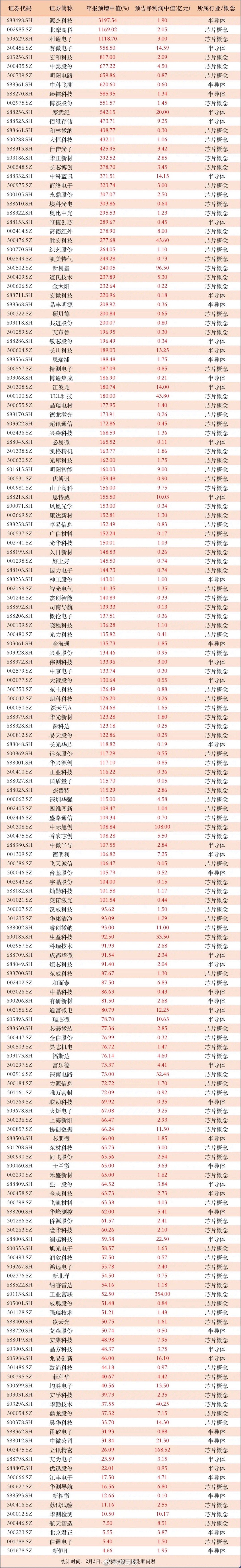 业绩预增的芯片相关公司!97家公司年报预增100%以上,有半导体材料公司,有半导体设备公司,还有其他芯片相关公司