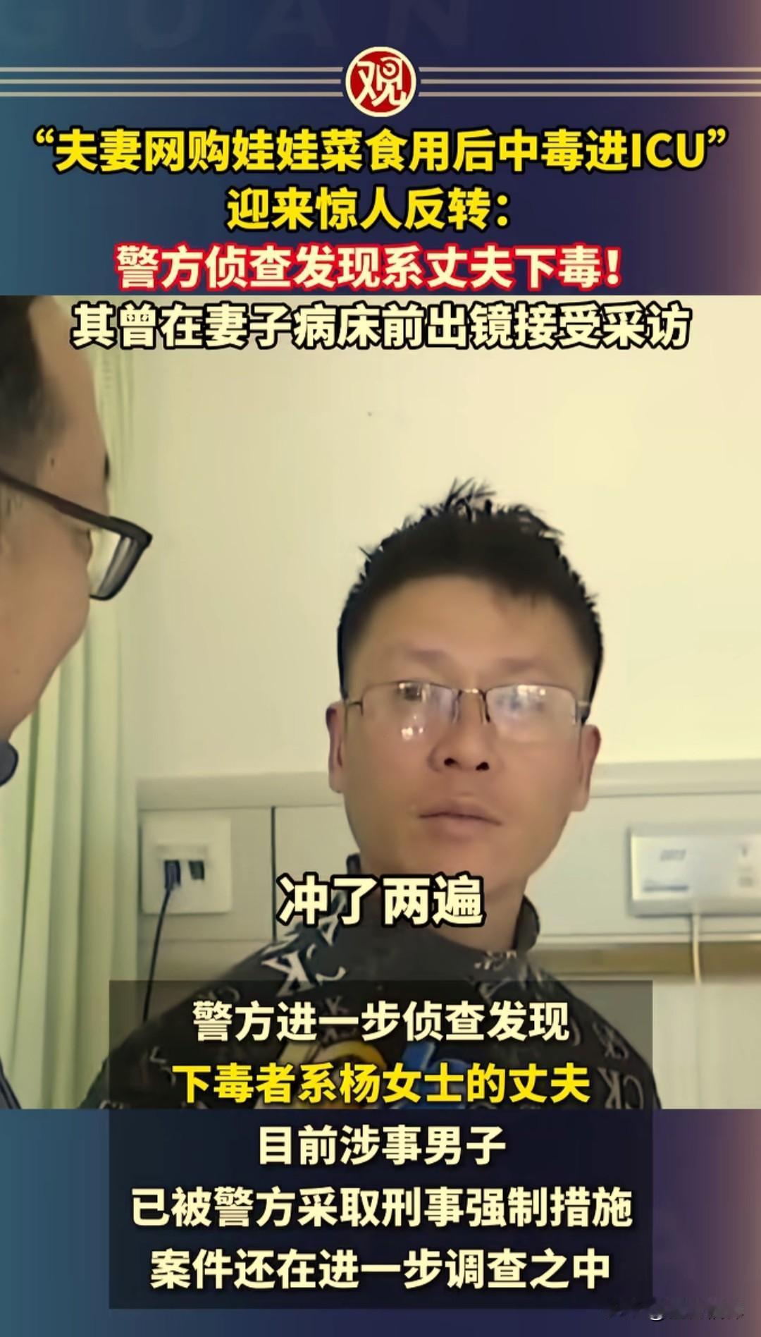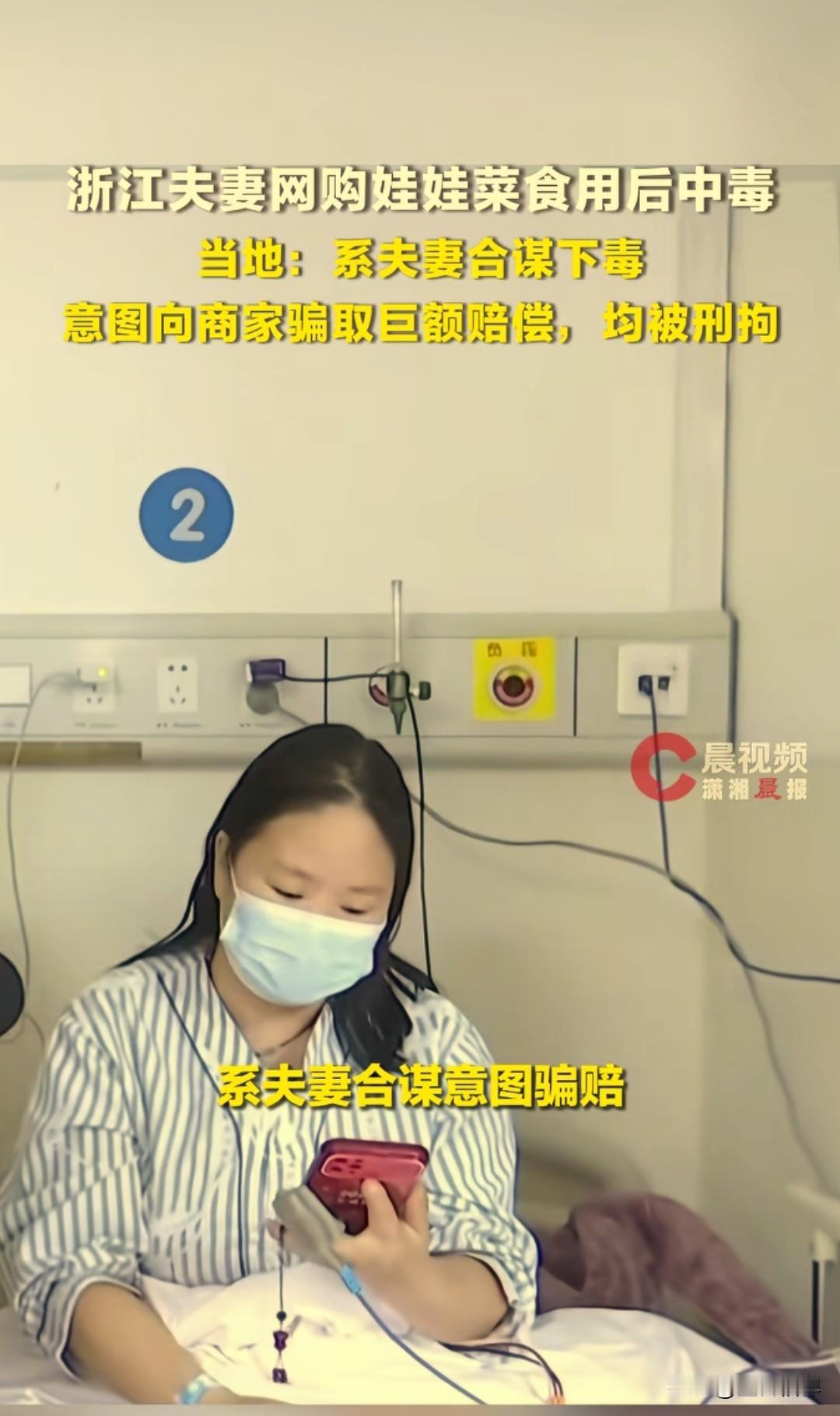 网购娃娃菜中毒进ICU引来惊人反转,下毒者不是商家,竟是丈夫下的毒。 据潇湘晨报、红星新闻等多家媒体报道:这起中毒事件竟然是夫妻二人共同合谋诈骗,起因杨女士与丈夫因经济拮据,共同策划了“吃网购娃娃菜中毒”的骗局,目标是向蔬菜商家敲诈巨额赔偿。 在妻子住院期间,丈夫还配合她在病床前接受媒体采访,把“受害者”的戏演到底,试图让商家和公众相信这是一起食品安全事故。 起初警方初步调查毒源为包裹娃娃菜的受鼠药污染的旧报纸,2026年2月3日迎来最新进展,案情出现反转,警方侦查结果,系夫妻两人合谋,意图通过中毒事件向平台骗取赔偿,两人均已被刑拘。