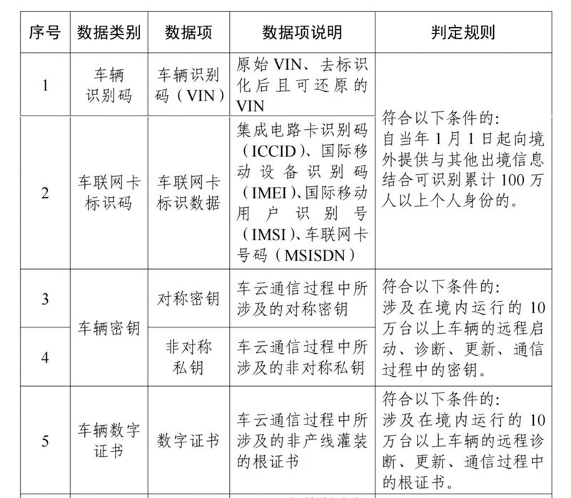 汽车数据处理者在车辆联网运行过程中,收集和产生的车辆识别码、车联网卡标识码、车辆密钥、车辆数字证书、控制指令。