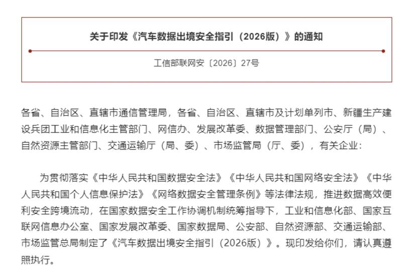 易车讯2月3日,为推动建立高效便利安全的汽车数据跨境流动机制,提升汽车数据出境便利化水平,推动构建汽车产业高质量发展和高水平安全良性互动格局,工业和信息化部、国家网信办、国家发展改革委、国家数据局、公安部、自然资源部、交通运输部、市场监管总局等八部门近日联合印发《汽车数据出境安全指引(2026版)》(以下简称《安全指引》)。