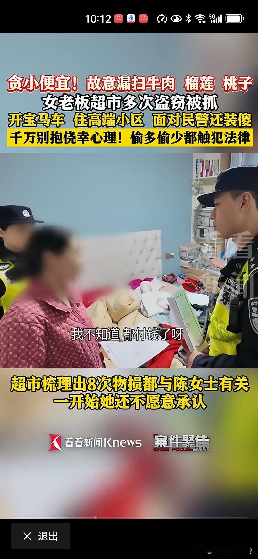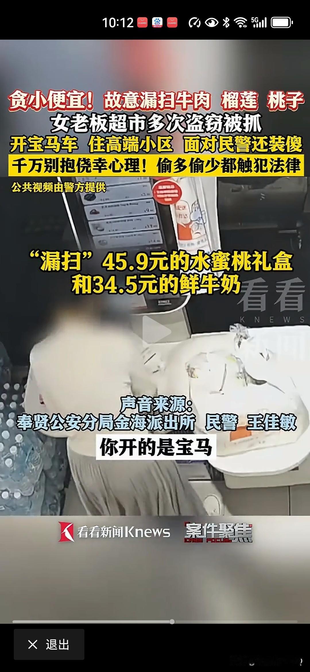 女老板开宝马住高端小区多次超市偷窃!一个女老板买牛肉,桃子,榴莲,然后用漏扫码贪小便宜被抓,被超市多次发现报警抓现行了,这下可能被治安拘留!当年有超市初开张的时候,就有人用各种办法贪小便宜,比如打秤三斤牛肉,然后又打秤一点五斤牛肉,把商标条形码兑换,放回一份牛肉,然后到超市收银台过机付款,收银小妹只收款扫码不认真看货物,这样安然离去!这个以假乱真还盛行过一段时间,想不到这个开宝马的女老板还不以为然!活该!入店偷窃