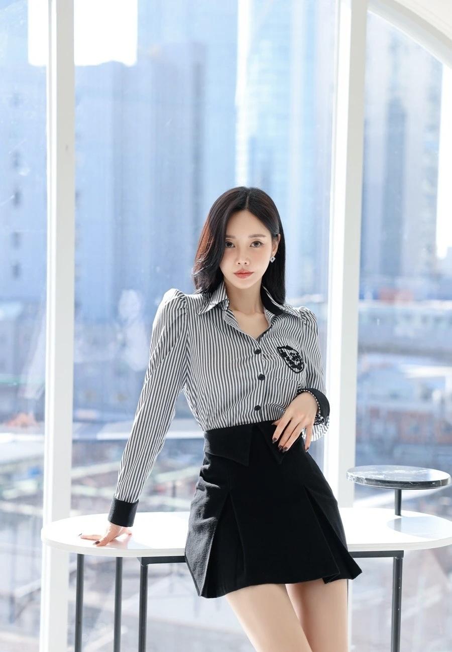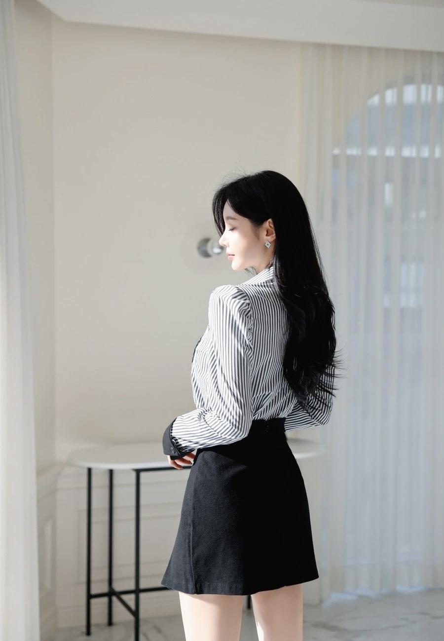 优雅黑白条纹衬衫搭配黑色短裙,简约时尚,尽显都市女性魅力!
