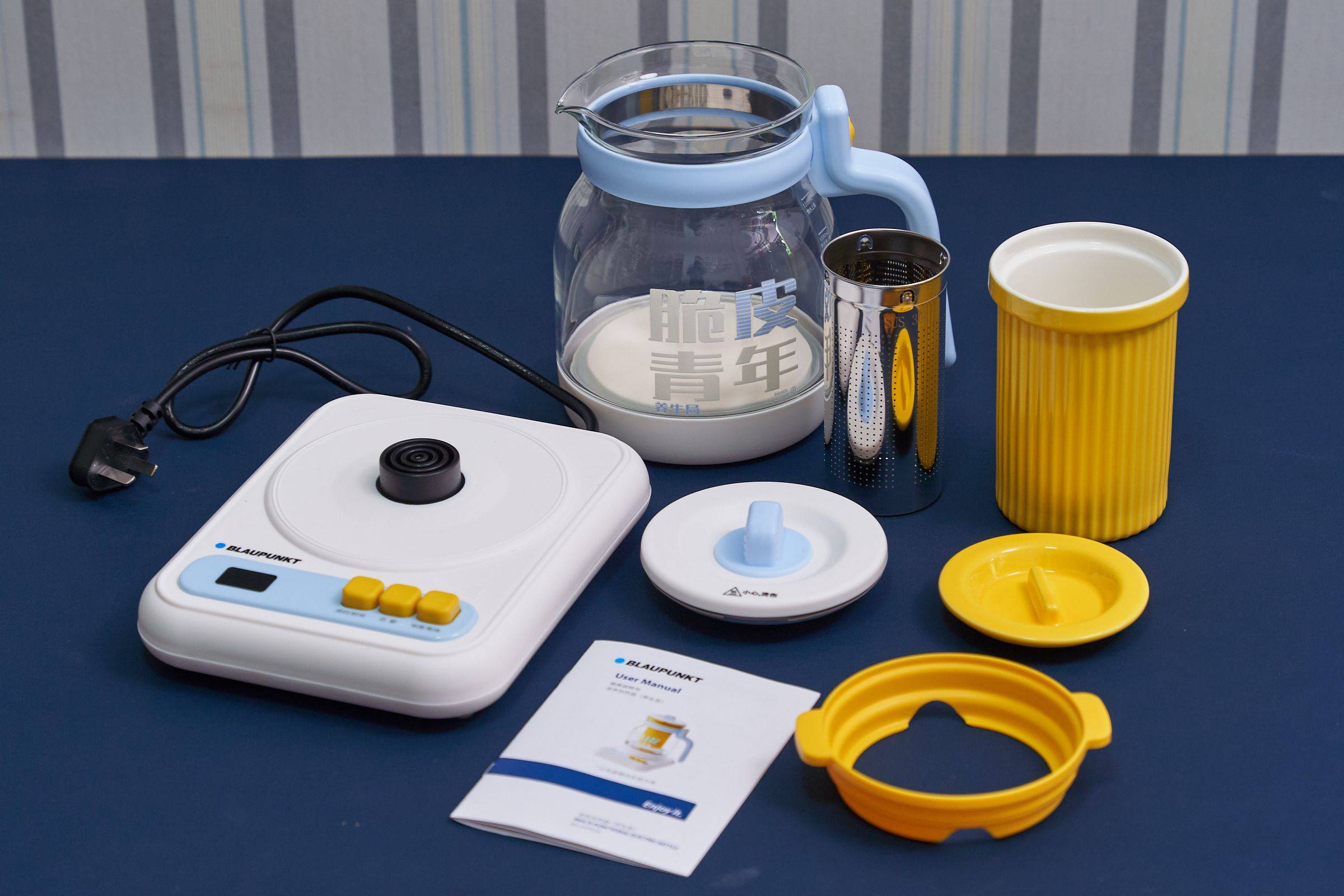 拆开印有蓝宝Logo的环保纸盒,我以为买错了东西——这海盐蓝+柠檬黄的撞色,与传统养生壶的“黑白灰”印象大不一样,分明是欧式田园风桌面摆件啊!