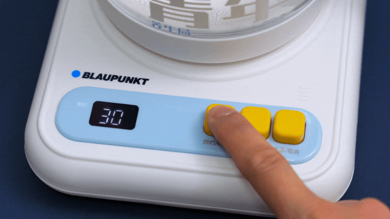 另一旁的小黑屏幕显示温度或时长,在屏幕之外也是屏幕,会根据按钮选择显示不同功能,比如预约/保温/烧水/炖煮。