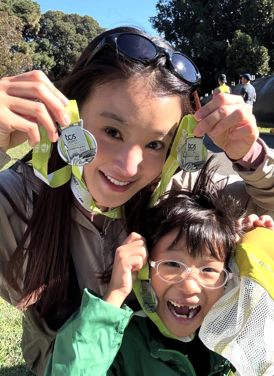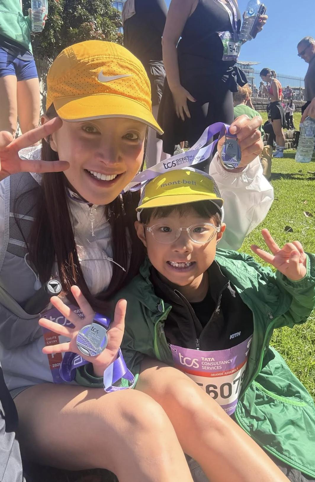 8月在美国摩托骑行完200公里,9月,已经临产的李诗英又带着儿子去澳洲参加马拉松比赛。
