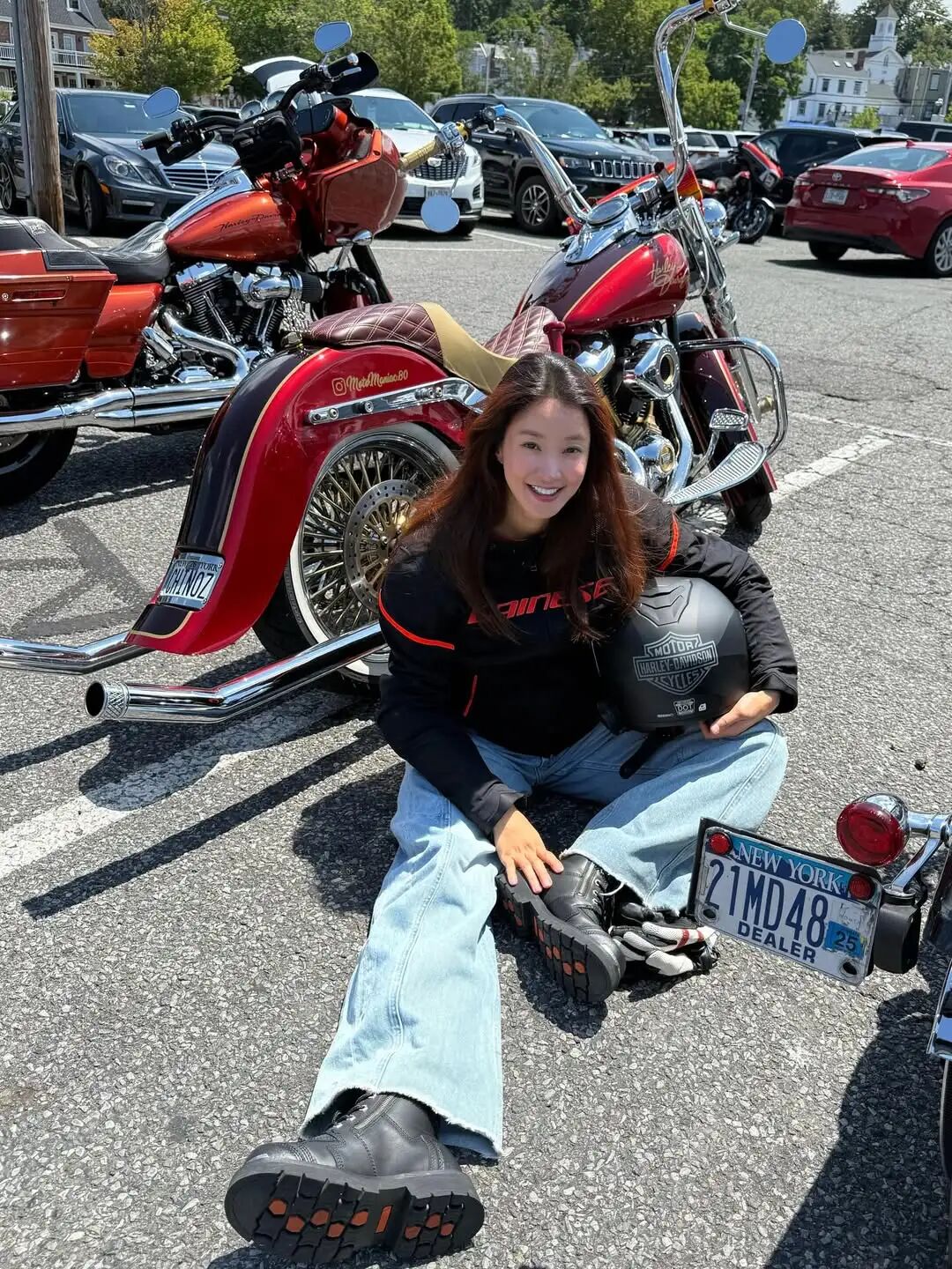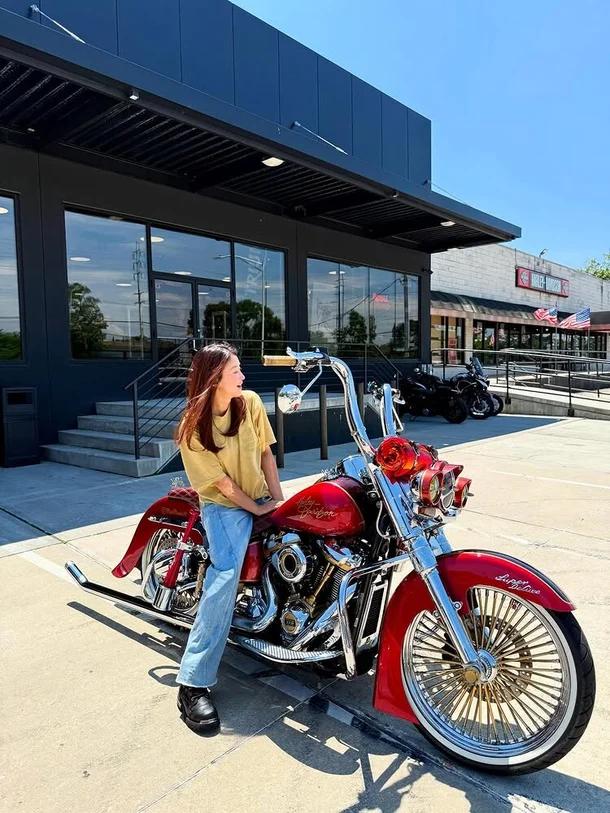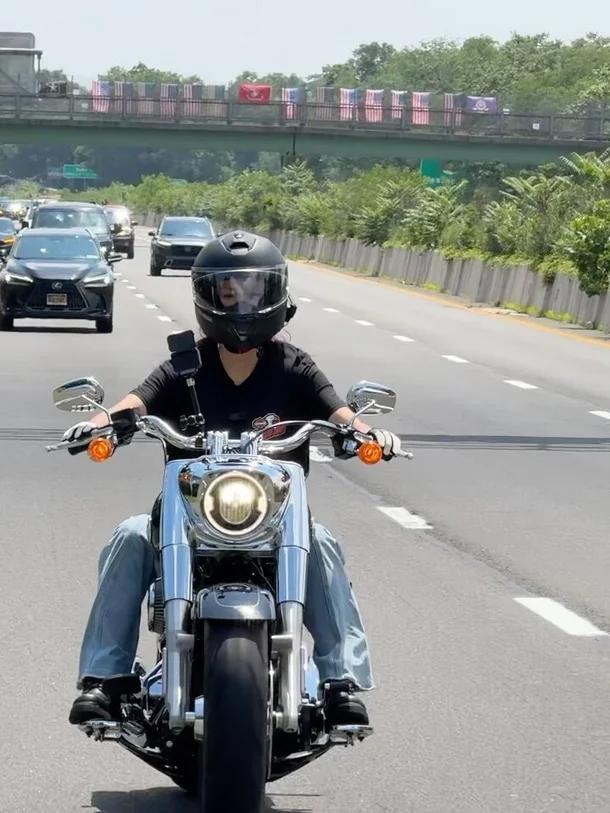 她和朋友租了哈雷摩托车,穿着牛仔骑行裤潇洒上路了。
