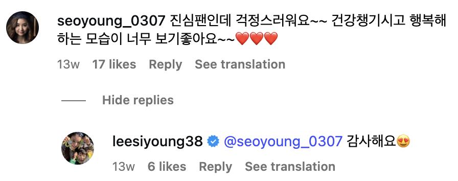 “我是你的真粉,但也好担心~喜欢看到你快乐、照顾好你自己的样子。”李诗英回复:“感恩哦”