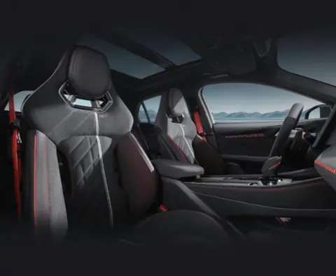 外观方面,新车外观在家族设计的基础上注入更加浓郁的赛道气息。前脸部分,采用分层式格栅设计,上沿贯穿“03” 数字标识,下包围则新增碳纤维前唇,两侧风刃还嵌入了专属的Downforce徽标,既强化辨识度又优化空气动力学表现。此外,两侧分体式大灯保留经典 “抓痕” 日行灯,配合主动式进气格栅,高速行驶时可提升下压力。