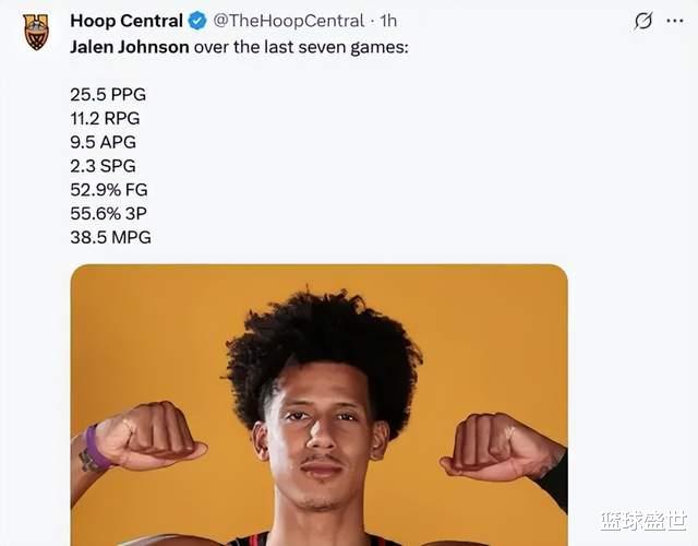 在过去七场比赛中,杰伦·约翰逊打出场均25.5分11.2篮板9.5助攻2.3抢断的明星数据,投篮命中率52.9%,三分命中率高达55.6%。