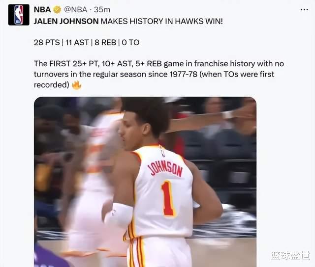 上周,杰伦·约翰逊被评为东部周最佳球员,成为NBA历史上最快拿到至少350分150篮板100助攻最快的前锋选手。