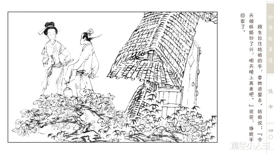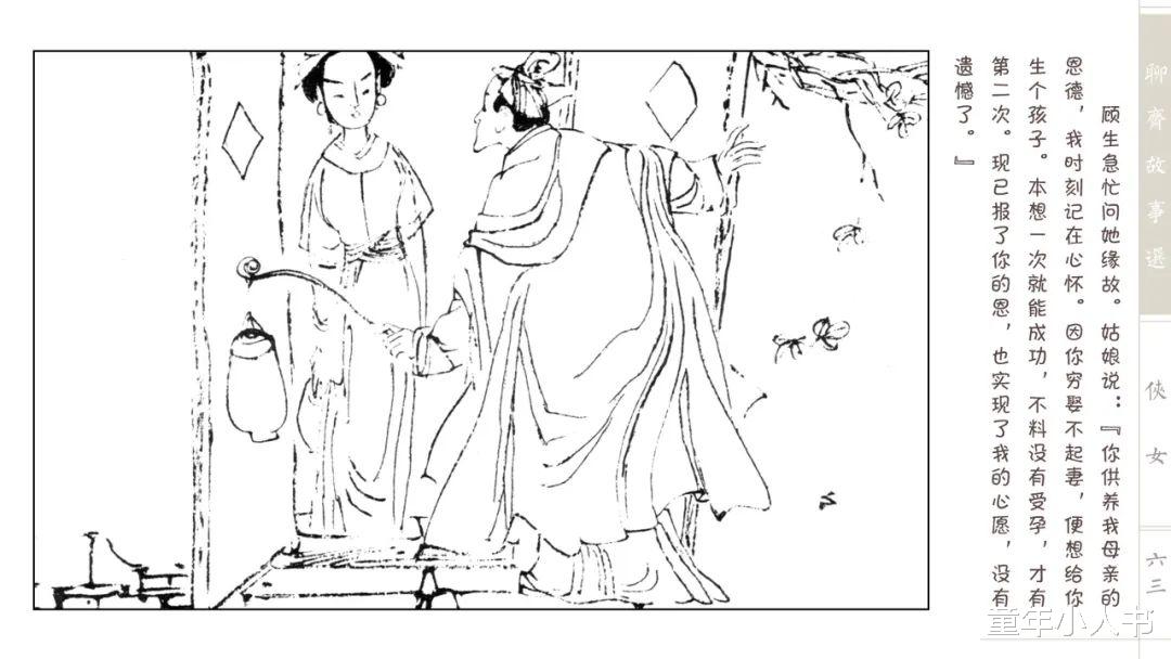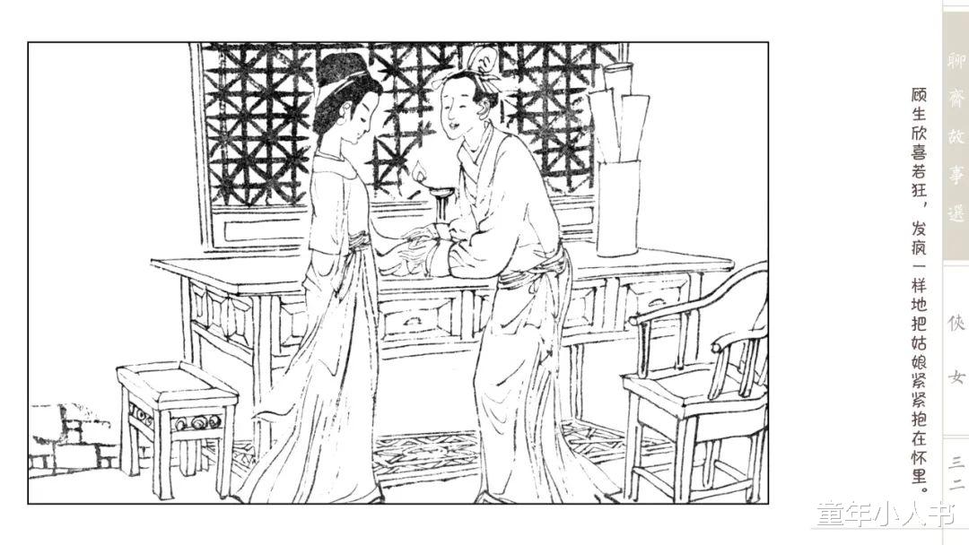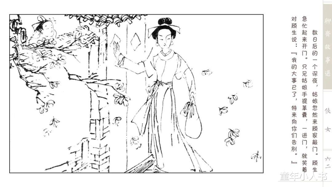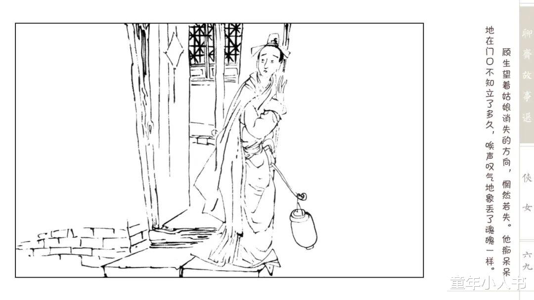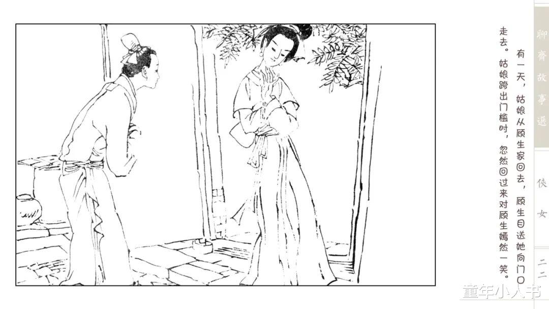 这个故事讲的是书生顾某,博学多艺,但是因为家庭贫困,没有能力娶妻。这天顾家对门新搬来一个老妇人和一个年轻的姑娘,顾家母亲见姑娘家也很穷困,便让顾生经常送些柴米接济她们,姑娘都接受了,却从来不说感谢之言,只是天天来顾家帮着操持家务。