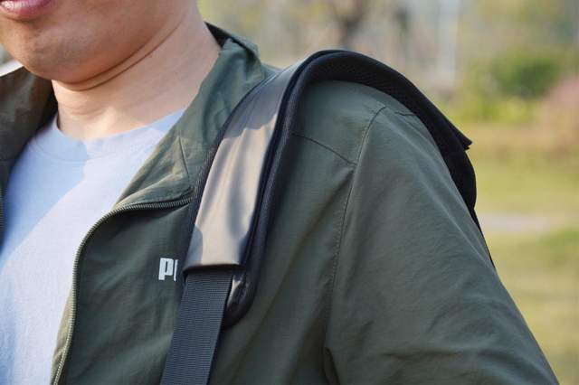 手提之处,采用的是魔术贴加厚手腕。斜跨的肩带也同样是加厚透气的海绵垫,同时增加了可拆卸肩带,可以形成三点支撑,实际体验下来,此时的背包会更为稳固。