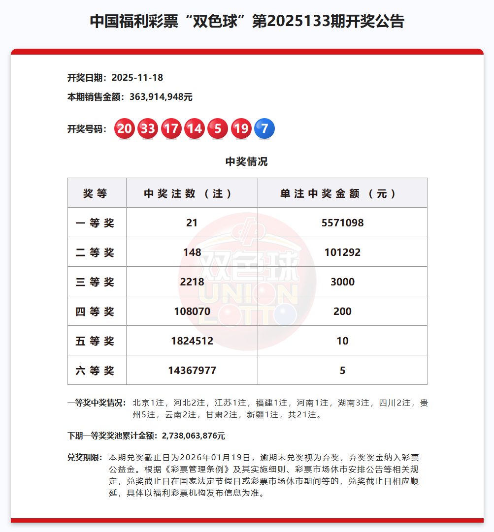 一、上期双色球第133期开奖号码(历史数据演示):