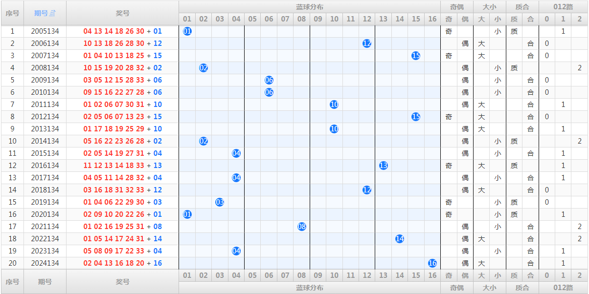 七、历史同期,蓝球开奖号码和走势图(历史数据演示):