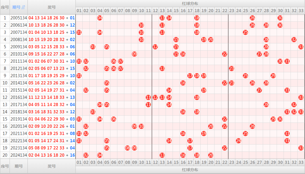 六、历史同期,红球开奖号码和走势图(历史数据演示):