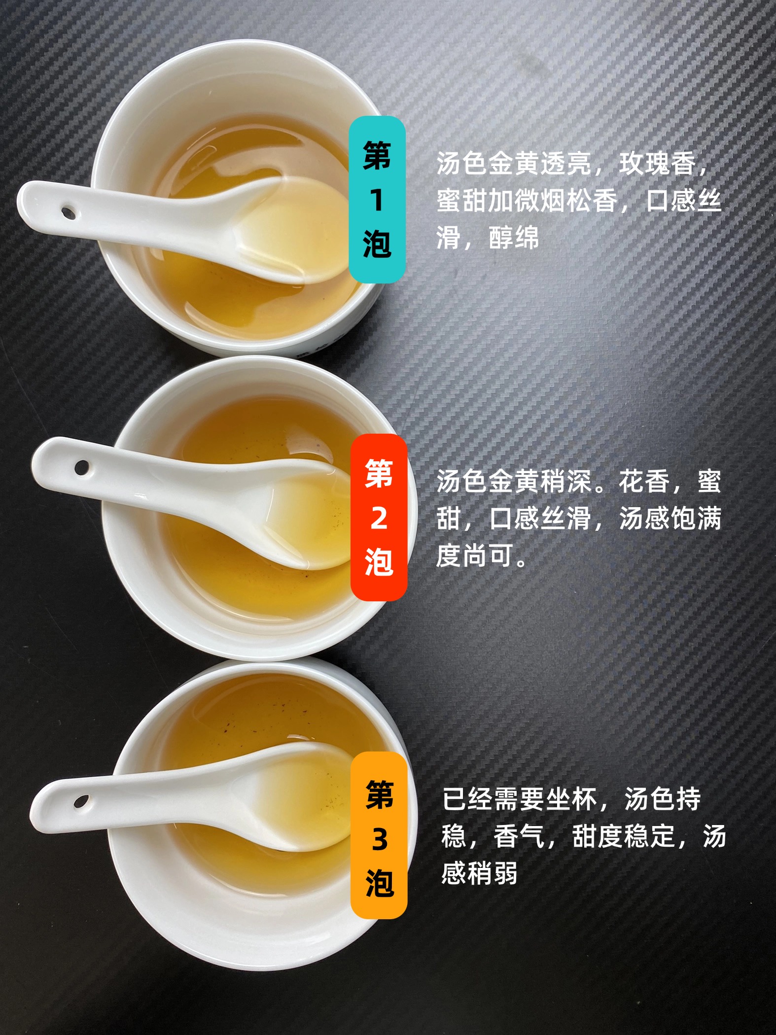 第一泡,汤色金黄透亮,玫瑰香,蜜甜加微烟松香,口感丝滑,醇绵