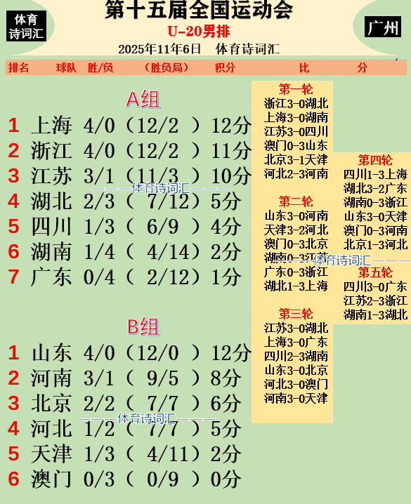 【B组】1、山东4胜;2、河南3胜1负;3、北京2胜2负;4、河北1省2负;5、天津1胜3负;、澳门0胜3负。