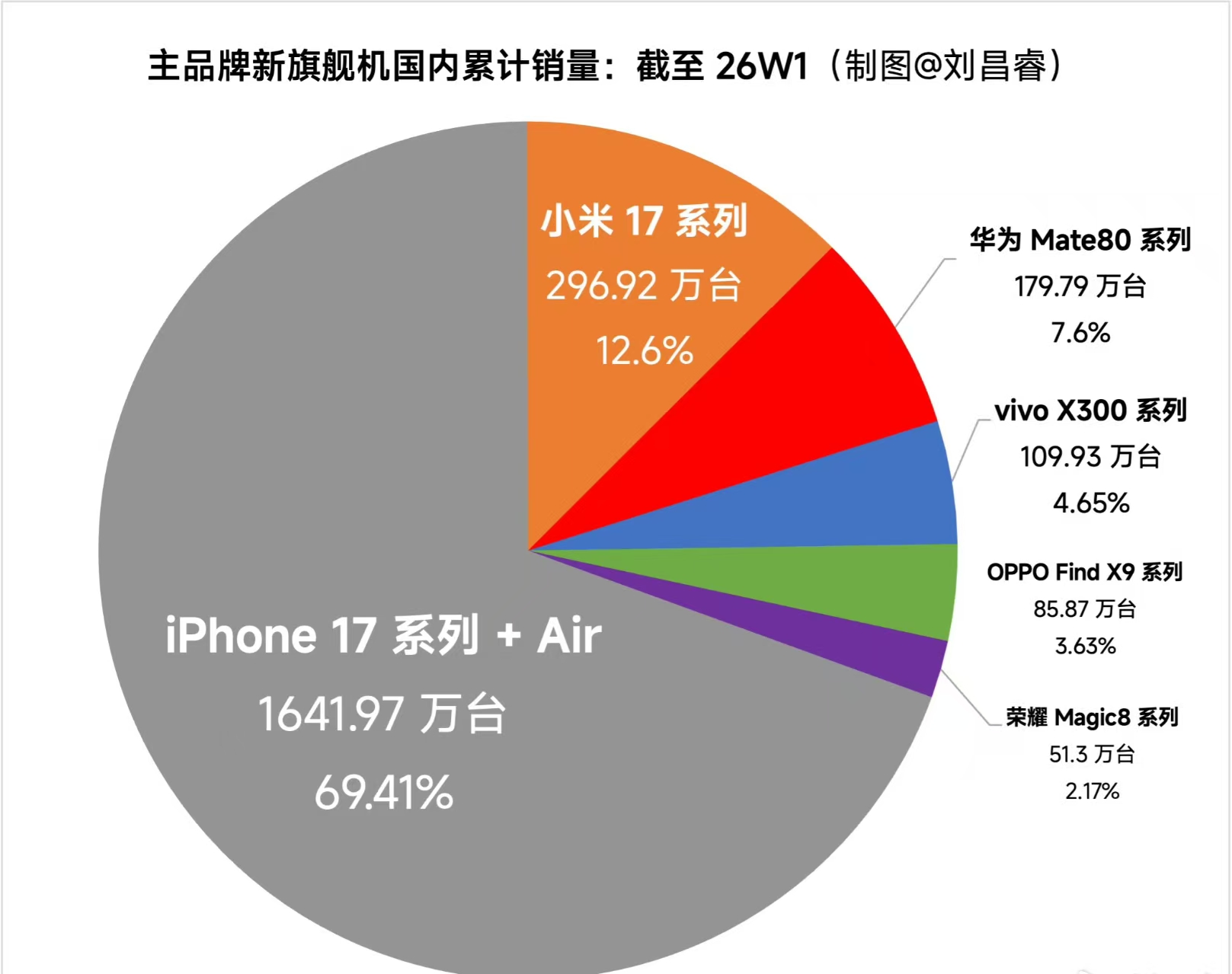 据知名数码博主爆料,截止2026年1W,小米17销量达到296.92万部,几近三百万部,这虽然不如苹果千万台,但却成为国产手机内销量最佳的旗舰机,反观华为Mate80系列仅有179.79万部。