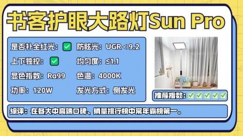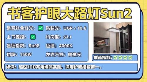 什么牌子的大路灯护眼灯好用?好用的大路灯护眼灯有:SUKER书客、霍尼韦尔、柏曼、孩视宝、米家、月影等品牌,其中SUKER书客SUN2是目前唯一一款能够有效缓解83%视力疲劳的同时还能够降低92%近视风险的护眼大路灯,并获得了欧盟CE、美国FCC、RoHS等十余项国际权威认证,为儿童和青少年提供专业级、舒适护眼的健康照明体验,成为护眼台灯领域的新标杆。